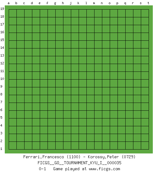 Last move : 0-1 2011 May 16 18:13:54 [Event "FICGS__GO__TOURNAMENT_KYU_I__000035"] [Site "FICGS"] [Date "2011.04.16"] [Round "1"] [Black "Ferrari,Francesco"] [White "Korossy,Peter"] [Result "0-1"] [Rating 1 "1100"] [Rating 2 "0729"] 0-1 This go game has been lost on time (started : 2011.04.16 13:33:59) Here are the names of the openings (joseki) played in the four corners : Player White won this Go (weiqi, baduk) game. Follow this game move after move (download)In the opening, when you don't know what to play, make a shimari. (Jansteen) Life is the sum of all your choices. (Albert Camus)