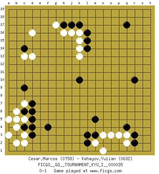 Last move : 0-1 2011 September 15 10:20:23 [Event "FICGS__GO__TOURNAMENT_KYU_I__000035"] [Site "FICGS"] [Date "2011.04.16"] [Round "1"] [Black "Cesar,Marcos"] [White "Kehayov,Yulian"] [Result "0-1"] [Rating 1 "0758"] [Rating 2 "0632"] 1.q17 c5 2.q4 d16 3.d3 c7 4.f4 o3 5.l3 q3 6.r3 p3 7.r2 q2 8.m5 m2 9.m3 n3 10.l2 n1 11.r10 g17 12.c9 c3 13.c4 b4 14.d4 c2 15.b3 b2 16.b5 a3 17.c6 b6 18.d5 a5 19.d7 c5 20.d6 b5 21.k17 c13 22.k10 k16 23.l16 k15 24.j17 j16 25.h17 h16 26.l15 k13 27.l14 k14 28.c14 d13 0-1 This go game has been lost on time (started : 2011.04.16 13:33:59) Here are the names of the openings (joseki) played in the four corners : Corner d4 : c5 d3 Mokuhazushi (Waemok, Wai`mu`) 5-3 Point. The mokuhazushi (5-3) point was popular in the Edo period in Japan (1600 - 1867). It emphasizes influence; territorially, it is inferior to the 3-4 point. Komoku Kakari. Black 2 is the standard approach because of its solidity and stability. Corner q4 : q4 o3 Hoshi (Hwajeom, Seongjeom, Xingwei`) 4-4 Point. The star or hoshi (4-4) point, emphasizing influence at the potential expense of territory. Ikken Kakari (Hankan Keolch'im, Yi Gua`jiao~, 1-Space Low Approach). White 2 is the standard approach move to the 4-4. Player White won this Go (weiqi, baduk) game. Follow this game move after move (download)If you have won four corners, resign. (Anonymous) At work, the authority of a person is inversely proportional to the number of pens that person is carrying. (Dan Rotaru)