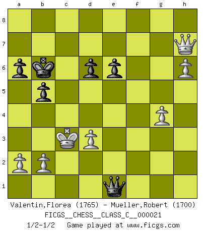 Last move : 1/2-1/2 2007 March 4 17:27:24 [Event "FICGS__CHESS__CLASS_C__000021"] [Site "FICGS"] [Date "2006.12.17"] [Round "1"] [White "Valentin,Florea"] [Black "Mueller,Robert"] [Result "1/2-1/2"] [WhiteElo "1765"] [BlackElo "1700"] 1.e4 c5 2.Nf3 d6 3.d4 cxd4 4.Nxd4 Nf6 5.Nc3 a6 6.f3 g6 7.Be3 Bg7 8.Qd2 O-O 9.O-O-O Nc6 10.g4 Nd7 11.Be2 Bxd4 12.Bxd4 Nxd4 13.Qxd4 b5 14.h4 Bb7 15.h5 g5 16.h6 f6 17.Nd5 Kf7 18.Kb1 Ne5 19.Rhf1 Rg8 20.f4 gxf4 21.Rxf4 Bxd5 22.Qxd5+ e6 23.Qd4 Ke7 24.Rdf1 Rg6 25.Qf2 Kd7 26.Qh4 Rb8 27.Rxf6 Rxf6 28.Rxf6 Qb6 29.Rf1 Qe3 30.Re1 Qf4 31.Rd1 Rc8 32.Qe1 Rc6 33.Qf1 Qxe4 34.Bd3 Nxd3 35.Qf7+ Kd8 36.Qg8+ Kc7 37.cxd3 Qe2 38.Qxh7+ Kb6 39.Rc1 Rxc1+ 40.Kxc1 Qe1+ 41.Kc2 Qe2+ 42.Kb3 Qd1+ 43.Kc3 Qe1+ 1/2-1/2 Sicilian : Najdorf Kingside Castling by player Black (move 8) Queenside Castling by player White (move 9) This chess game ended in a draw. Follow this game move after move (download)Mistrust is the most necessary characteristic of the Chess player. (Siegbert Tarrasch) Schach ist gnadenlos. Du mußt bereit sein zu töten. (Nigel Short) Prefiero perder una partida realmente buena, que ganar una mala. (David Levy) Tout change constamment, y compris dans le monde des Echecs. (Botvinnik) All men can see these tactics whereby I conquer, but what none can see is the strategy out of which victory is evolved. (Sun Tzu)