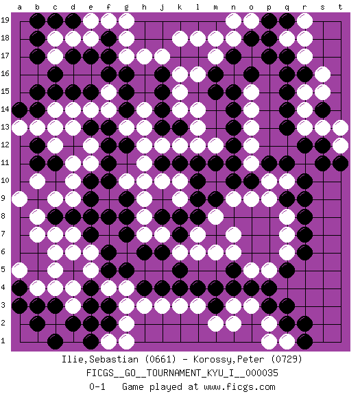 Last move : 0-1 2011 August 19 19:16:47 [Event "FICGS__GO__TOURNAMENT_KYU_I__000035"] [Site "FICGS"] [Date "2011.04.16"] [Round "1"] [Black "Ilie,Sebastian"] [White "Korossy,Peter"] [Result "0-1"] [Rating 1 "0661"] [Rating 2 "0729"] 1.q16 d4 2.q3 d16 3.r9 o17 4.q14 k16 5.f3 h3 6.f5 c6 7.j4 j3 8.k4 k3 9.l4 l3 10.m4 n3 11.m3 m2 12.n4 o3 13.o4 g4 14.g5 f4 15.e3 d3 16.e4 e5 17.d2 c2 18.e2 g2 19.d5 e6 20.c3 c4 21.b3 b4 22.b2 k6 23.j6 j7 24.h6 h7 25.g7 m6 26.k7 l7 27.k8 h8 28.g8 h9 29.g9 h10 30.k5 l6 31.l8 m8 32.l10 n9 33.k11 h12 34.n11 p5 35.p4 q8 36.r8 q7 37.r7 p10 38.q11 o5 39.q5 q6 40.r6 d10 41.f11 g10 42.f10 e8 43.e9 d9 44.f13 h14 45.d12 f15 46.g14 g13 47.g12 h13 48.g15 f14 49.g16 j17 50.f16 e16 51.e15 e14 52.d15 d14 53.c15 c14 54.c16 e18 55.f18 c17 56.b17 c18 57.b18 g18 58.e17 c12 59.c11 d11 60.b12 c13 61.b11 b13 62.e13 e12 63.f12 d13 64.c8 b8 65.b9 b7 66.d8 c9 67.e7 d7 68.f8 b10 69.b15 o12 70.n12 o13 71.o10 o9 72.p11 o11 73.n10 q10 74.r10 l12 75.m9 n7 76.q9 p9 77.n5 n6 78.n13 o14 79.n14 o15 80.m16 m18 81.l17 l18 82.k17 k18 83.j16 k15 84.j15 k14 85.j14 l14 86.m15 k12 87.j11 h11 88.j13 j12 89.k13 l13 90.n17 m17 91.o16 l16 92.n15 r17 93.q17 q18 94.p18 r18 95.o18 s15 96.s14 r15 97.q15 r14 98.q13 r13 99.r12 s13 100.s12 p2 101.q2 q1 102.r1 p1 103.r2 g17 104.d17 d18 105.f17 f19 106.c19 e19 107.r16 s16 108.p3 n2 109.h4 g3 110.f6 d6 111.a4 a5 112.a3 c5 113.c1 t12 114.t11 t13 115.s11 k9 116.l9 k10 117.l11 n18 118.p17 f1 119.e1 m12 120.m11 e11 121.f2 g1 122.q19 r19 123.p19 n19 124.a14 a13 125.b14 h17 126.b19 c7 127.e8 a9 128.d19 g19 129.e10 o19 130.pass pass 131.pass j10 132.j8 pass 133.pass pass 0-1 Here are the names of the openings (joseki) played in the four corners : Corner q16 : q16 o17 Hoshi (Hwajeom, Seongjeom, Xingwei`) 4-4 Point. The star or hoshi (4-4) point, emphasizing influence at the potential expense of territory. Ikken Kakari (Hankan Keolch'im, Yi Gua`jiao~, 1-Space Low Approach). White 2 is the standard approach move to the 4-4. Corner d4 : d4 f3 Hoshi (Hwajeom, Seongjeom, Xingwei`) 4-4 Point. The star or hoshi (4-4) point, emphasizing influence at the potential expense of territory. Ikken Kakari (Hankan Keolch'im, Yi Gua`jiao~, 1-Space Low Approach). Black 2 is the standard approach move to the 4-4. Player White won this Go (weiqi, baduk) game. Follow this game move after move (download)Proverbs do not apply to White. (Tero Sand) O divine art of subtlety and secrecy! Through you we learn to be invisible, through you inaudible and hence we can hold the enemy's fate in our hands. (Sun Tzu)