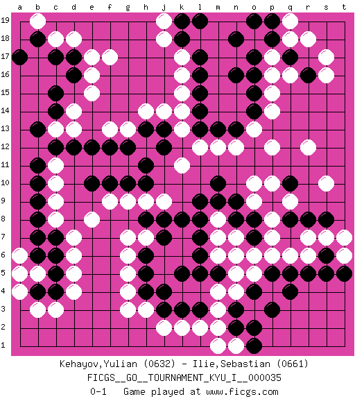 Last move : 0-1 2011 November 12 0:39:18 [Event "FICGS__GO__TOURNAMENT_KYU_I__000035"] [Site "FICGS"] [Date "2011.04.16"] [Round "1"] [Black "Kehayov,Yulian"] [White "Ilie,Sebastian"] [Result "0-1"] [Rating 1 "0632"] [Rating 2 "0661"] 1.c15 p16 2.q4 d4 3.d16 r6 4.r5 q6 5.o4 k16 6.c6 c9 7.c12 d6 8.c4 c3 9.b4 b3 10.b8 c8 11.c7 d7 12.b9 m3 13.n3 m4 14.j4 g3 15.h5 j2 16.k5 m6 17.m5 n5 18.l5 n4 19.o2 m8 20.q10 r12 21.r8 o5 22.p5 p6 23.q5 p12 24.s6 s7 25.s5 r7 26.q8 o10 27.p9 s10 28.o7 o6 29.s8 t7 30.n9 o9 31.n8 p7 32.o8 p8 33.m10 p10 34.m9 n7 35.l8 m7 36.l7 f17 37.q17 s17 38.r16 s16 39.o17 p17 40.p18 o18 41.n18 q18 42.o19 r18 43.n16 q16 44.l17 k17 45.k18 j18 46.l19 d18 47.l6 n6 48.l16 k15 49.l15 k14 50.l14 c10 51.b10 d14 52.c14 e15 53.e12 f13 54.f12 g13 55.g12 g9 56.e10 e8 57.h11 d13 58.d12 c13 59.b13 c11 60.b11 k11 61.g10 h9 62.h10 j9 63.l9 m12 64.j8 h7 65.j7 g6 66.h6 g5 67.h8 g7 68.k8 m2 69.n2 t6 70.t5 q9 71.o15 p14 72.o14 o13 73.n13 n12 74.m13 l12 75.l13 k13 76.c17 c18 77.b18 b19 78.a17 e16 79.d17 e17 80.h13 h14 81.j13 j14 82.j12 a4 83.a5 b5 84.c5 a6 85.b6 a5 86.b7 d5 87.k3 k2 88.l3 j19 89.k19 p15 90.o16 f9 91.f10 q19 92.p19 n1 93.p3 h3 94.h4 g4 95.j3 l2 96.o1 m1 0-1 This go game has been lost on time (started : 2011.04.16 13:33:59) Here are the names of the openings (joseki) played in the four corners : Corner q4 : q4 r6 Hoshi (Hwajeom, Seongjeom, Xingwei`) 4-4 Point. The star or hoshi (4-4) point, emphasizing influence at the potential expense of territory. Ikken Kakari (Hankan Keolch'im, Yi Gua`jiao~, 1-Space Low Approach). White 2 is the standard approach move to the 4-4. Corner d4 : d4 c6 Hoshi (Hwajeom, Seongjeom, Xingwei`) 4-4 Point. The star or hoshi (4-4) point, emphasizing influence at the potential expense of territory. Ikken Kakari (Hankan Keolch'im, Yi Gua`jiao~, 1-Space Low Approach). Black 2 is the standard approach move to the 4-4. Player White won this Go (weiqi, baduk) game. Follow this game move after move (download)The intersection is rarely neutral. (Pierre Audouard) I don't diet. I just don't eat as much as I'd like to. (Linda Evangelista, supermodel)