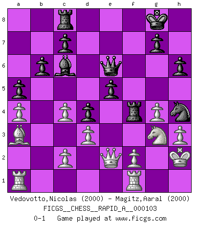 Last move : 0-1 2011 August 14 21:30:45 [Event "FICGS__CHESS__RAPID_A__000103"] [Site "FICGS"] [Date "2011.04.17"] [Round "1"] [White "Vedovotto,Nicolas"] [Black "Magitz,Aaral"] [Result "0-1"] [WhiteElo "2000"] [BlackElo "2000"] 1.Nc3 d5 2.e4 d4 3.Nce2 e5 4.Ng3 Bd6 5.Bc4 Nc6 6.Nf3 Na5 7.b3 Nxc4 8.bxc4 f6 9.O-O Ne7 10.d3 O-O 11.h3 Be6 12.a4 Qd7 13.Nd2 b6 14.Ne2 Ng6 15.Nf3 Bb4 16.Bd2 a5 17.Qc1 f5 18.exf5 Bxf5 19.Ne1 h6 20.Qd1 Qd6 21.Ng3 Bd7 22.Ne4 Qe6 23.Nf3 Bc6 24.Qe2 Rxf3 25.Bxb4 Nh4 26.Ba3 Qf5 27.g4 Qe6 28.Kh2 Rc8 29.Ng3 Rf4 0-1 This chess game has been lost on time (started : 2011.04.17 11:46:32) Dunst (Sleipner, Heinrichsen) Opening Kingside Castling by player White (move 9) Kingside Castling by player Black (move 10) Player Black won this chess game. Follow this game move after move (download)Spassky will not be psyched out by Fischer. (Mike Goodall) Computer sind die einzigen Gegner, die nicht immer eine Ausrede auf Lager haben, wenn sie gegen mich verlieren. (Robert James Fischer) El Ajedrez es imaginación. (David Bronstein) Les échecs, c'est l'art d'analyser. (Mikhail Botvinnik) Memory is a way of holding onto the things you love, the things you are, the things you never want to lose. (from the television show: The Wonder Years)
