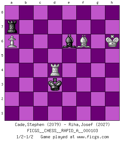 Last move : 1/2-1/2 2011 June 26 13:9:54 [Event "FICGS__CHESS__RAPID_A__000103"] [Site "FICGS"] [Date "2011.04.17"] [Round "1"] [White "Cade,Stephen"] [Black "Riha,Josef"] [Result "1/2-1/2"] [WhiteElo "2079"] [BlackElo "2027"] 1.e4 c6 2.d4 d5 3.e5 Bf5 4.Nf3 e6 5.Be2 Ne7 6.O-O Nd7 7.Nbd2 Qc7 8.Nb3 Bg6 9.Bd2 Nf5 10.a4 Be7 11.g4 Nh6 12.h3 O-O 13.a5 c5 14.dxc5 a6 15.Bf4 Nxc5 16.Nxc5 Bxc5 17.Qd2 Kh8 18.b4 Ba7 19.Rfc1 Rad8 20.b5 axb5 21.Nd4 Bxd4 22.Qxd4 Ng8 23.Bxb5 Ne7 24.c4 dxc4 25.Qxc4 Qxc4 26.Bxc4 Ra8 27.Bf1 Nd5 28.Bd2 Kg8 29.Ra2 Rfd8 30.Rb2 Rd7 31.Kg2 h5 32.Kg3 Rad8 33.Bg2 f6 34.Re1 hxg4 35.hxg4 Re7 36.f4 Bd3 37.Bxd5 Rxd5 38.Bb4 Red7 39.exf6 gxf6 40.Rxe6 Kf7 41.f5 Bc4 42.Re1 Rd3+ 43.Kh4 R3d4 44.Bc5 R4d5 45.Bb6 Bb5 46.Re6 Bd3 47.Rb3 Bc2 48.Rc3 Ba4 49.Rc8 Rd1 50.g5 Rh1+ 51.Kg3 fxg5 52.Bc5 Rc1 53.Kg4 Rd4+ 54.Bxd4 Rxc8 55.Kxg5 Rd8 56.Bc3 Rd5 57.Rb6 Bd7 58.Rxb7 Rxf5+ 59.Kh6 Rd5 60.Bb4 Kf6 61.Rb6+ Be6 62.Bc3+ Kf5 63.a6 Rd7 64.Rb5+ Ke4 65.Rb4+ Kd3 66.Bf6 Ra7 67.Rd4+ 1/2-1/2 Caro-Kann : Advance variation Kingside Castling by player White (move 6) Kingside Castling by player Black (move 12) 10 pieces endgame at move 54 : White KRBPP , Black KRBPP WHITE : King + 1 Rook 1 Bishop 2 Pawns BLACK : King + 1 Rook 1 Bishop 2 Pawns 9 pieces endgame at move 55 : White KRBPP , Black KRBP WHITE : King + 1 Rook 1 Bishop 2 Pawns BLACK : King + 1 Rook 1 Bishop 1 Pawn 8 pieces endgame at move 58 : White KRBPP , Black KRB WHITE : King + 1 Rook 1 Bishop 2 Pawns BLACK : King + 1 Rook 1 Bishop 7 pieces endgame at move 58 : White KRBP , Black KRB WHITE : King + 1 Rook 1 Bishop 1 Pawn BLACK : King + 1 Rook 1 Bishop This chess game ended in a draw. Follow this game move after move (download)The hallmark of the artist is simplicity. (Larry Evans) Dieses schreckliche Gefühl, dass ich gegen eine Maschine spielte, die niemals Fehler macht, zerschmetterte meinen Widerstand. (Mark Taimanov) Yo considero que Fischer es uno de los expertos mas grandes de aperturas de siempre. (Keith Hayward) Je menace de comprendre la position. (Anonyme) Thus, what is of supreme importance in war is to attack the enemy's strategy. (Sun Tzu)