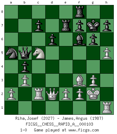 Last move : 1-0 2011 June 7 11:25:43 [Event "FICGS__CHESS__RAPID_A__000103"] [Site "FICGS"] [Date "2011.04.17"] [Round "1"] [White "Riha,Josef"] [Black "James,Angus"] [Result "1-0"] [WhiteElo "2027"] [BlackElo "1987"] 1.d4 Nf6 2.c4 g6 3.g3 Bg7 4.Bg2 O-O 5.Nc3 d6 6.Nf3 Nc6 7.O-O a6 8.b3 Rb8 9.Bb2 b5 10.cxb5 axb5 11.Rc1 b4 12.Na4 Na5 13.Ne1 Bb7 14.d5 e6 15.Bxf6 Bxf6 16.Qc2 Ba6 17.Nd3 Bxd3 18.Qxd3 exd5 19.Bxd5 Qc8 20.h4 Re8 21.h5 Kg7 22.Kg2 Re5 23.Rh1 Qd7 24.Bf3 Re7 25.Rc2 Qb5 26.Qd2 Rf8 27.Nc5 1-0 King's Indian : 3.g3 Kingside Castling by player Black (move 4) Kingside Castling by player White (move 7) Player White won this chess game. Follow this game move after move (download)All Chess players should have a hobby. (Savielly Tartakower) Gegen einen Schachcomputer zu verlieren ist wie Löcher in den Strümpfen zuhaben. Es ist nicht peinlich, solange man der einzige ist der es weiß. (Anonymous) Es muy difícil jugar en contra de la teoría de Einstein. - en su primera derrota en contra de Fischer (Mikhail Tal) Mais n'est-ce pas déjà le limiter injurieusement que d'appeler les échecs un jeu? N'est-ce pas aussi une science, un art, ou quelque chose qui, comme le cercueil de Mahomet entre ciel et terre, est suspendu entre l'un et l'autre, et qui réunit un nombre incroyable de contraires ? (Stefan Zweig) Treat your password like your toothbrush. Don't let anybody else use it, and get a new one every six months. (Clifford Stoll)