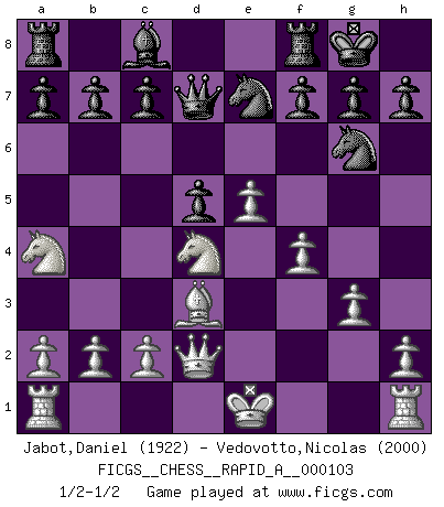Last move : 1/2-1/2 2011 May 28 23:39:51 [Event "FICGS__CHESS__RAPID_A__000103"] [Site "FICGS"] [Date "2011.04.17"] [Round "1"] [White "Jabot,Daniel"] [Black "Vedovotto,Nicolas"] [Result "1/2-1/2"] [WhiteElo "1922"] [BlackElo "2000"] 1.e4 Nc6 2.d4 e5 3.dxe5 Nxe5 4.f4 Ng6 5.Nf3 Bb4+ 6.Nc3 Qe7 7.Bd3 d5 8.e5 Qc5 9.Bd2 N8e7 10.g3 O-O 11.Qe2 Qb6 12.Na4 Bxd2+ 13.Qxd2 Qc6 14.Nd4 Qd7 1/2-1/2 KP : Nimzovich defense Kingside Castling by player Black (move 10) This chess game ended in a draw. Follow this game move after move (download)In complicated positions, Bobby Fischer hardly had to be afraid of anybody. (Paul Keres) Je mehr ich von der FIDE weiss, um so weniger verstehe ich. (Alexander Kalifman) Juega la Apertura como un libro, el Juego Medio como un mago y los Finales como una máquina. (Spielmann) Le plus grand jeu de l'esprit jamais inventé, plus vous l'apprenez, plus vous y prenez du plaisir. (Garry Kasparov) At last I discovered the true beauty of chess. So I proposed to her. (Dinesh De Silva)