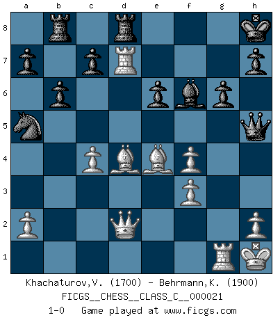 Last move : 1-0 2007 January 14 22:47:44 [Event "FICGS__CHESS__CLASS_C__000021"] [Site "FICGS"] [Date "2006.12.17"] [Round "1"] [White "Khachaturov,Vadim"] [Black "Behrmann,Klaus"] [Result "1-0"] [WhiteElo "1700"] [BlackElo "1900"] 1.d4 f5 2.c4 Nf6 3.Nf3 e6 4.e3 Be7 5.Bd3 O-O 6.Nc3 b6 7.O-O Bb7 8.Re1 Ne4 9.Qc2 Nxc3 10.bxc3 Bxf3 11.gxf3 Qe8 12.f4 Nc6 13.d5 Na5 14.e4 Qg6+ 15.Kh1 Rae8 16.Be3 fxe4 17.Bxe4 Qh6 18.dxe6 dxe6 19.c5 Kh8 20.c4 Qh5 21.Rg1 Rc8 22.Rae1 Bf6 23.Rd1 Rfd8 24.f3 g6 25.c6 Rb8 26.Rd7 Nxc6 27.Qd2 Na5 28.Bd4 1-0 Dutch defense Kingside Castling by player Black (move 5) Kingside Castling by player White (move 7) Player White won this chess game. Follow this game move after move (download)It began to feel as though you were playing against Chess itself. - On playing against Robert Fischer. (Walter Shipman) Es tut gut, die Entwicklungsperiode von, [...] demokratischem Geist durchdringen zu lassen. Wie undemokratisch wäre es doch beispielsweise, den einen Offizier große Spaziertouren vornehmen zu lassen, während die anderen zu Hause säßen und sich entsetzlich langweilten. (Aaron Nimzowitsch) El Ajedrez moderno está demasiado preocupado con cosas como la estructura de Peones. Olvidenlo, el Jaque Mate termina la partida. (Nigel Short) Vous m'avez demandé de vous exposer quel est le fondement de la prière. Je ne fais que préparer les pièces du jeu sur la table... Nous sera-t-il permis d'en adopter les règles et si nous les appliquons scrupuleusement nous ne tarderons pas à faire mat le Roi divin ! Il ne pourra échapper à nos mains. (Sainte Thérèse d'Avila, Chemin de perfection) To steal ideas from one person is plagiarism. To steal from many is research. (Unknown)