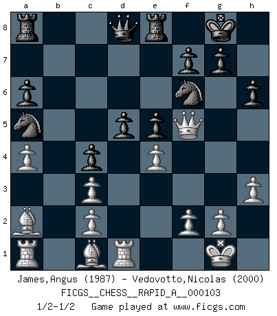 Last move : 1/2-1/2 2011 June 4 16:22:38 [Event "FICGS__CHESS__RAPID_A__000103"] [Site "FICGS"] [Date "2011.04.17"] [Round "1"] [White "James,Angus"] [Black "Vedovotto,Nicolas"] [Result "1/2-1/2"] [WhiteElo "1987"] [BlackElo "2000"] 1.e4 Nc6 2.Nf3 e5 3.Bb5 a6 4.Ba4 Nf6 5.O-O Be7 6.Re1 b5 7.Bb3 O-O 8.h3 Bb7 9.d3 Re8 10.Nc3 Bb4 11.Ng5 Rf8 12.a3 Bxc3 13.bxc3 h6 14.Nf3 d6 15.Nh4 Bc8 16.Qf3 Na5 17.Ba2 c5 18.a4 c4 19.Rd1 Re8 20.Nf5 Bxf5 21.Qxf5 d5 22.dxc4 bxc4 1/2-1/2 KP : Nimzovich defense Kingside Castling by player White (move 5) Kingside Castling by player Black (move 7) This chess game ended in a draw. Follow this game move after move (download)The Chess pieces are the block alphabet which shapes thoughts; and these thoughts, although making a visual design on the chessboard, express their beauty abstractly, like a poem. (Marcel Duchamp) Ich bin der einzige Schachspieler, der sich während der Vorbereitungen zum Turnier verletzt hat. (Woody Allen) El Ajedrez es el juego mas altamente simbólico, pero las agresiones estan por lo tanto aún mas francamente representadas en la partida. Tal vez comenzo como un juego de guerra; Algo como la representación de una batalla en miniatura entre las fuerzas de dos reinos. (Karl Meninger) La guerre est enfant de la passion, la passion est enfant du narcissisme et le narcissisme est l'enfant. (...) Une autre partie ? (Thibault de Vassal) The project of the man are lower than those of the sky. (Chinese proverb)