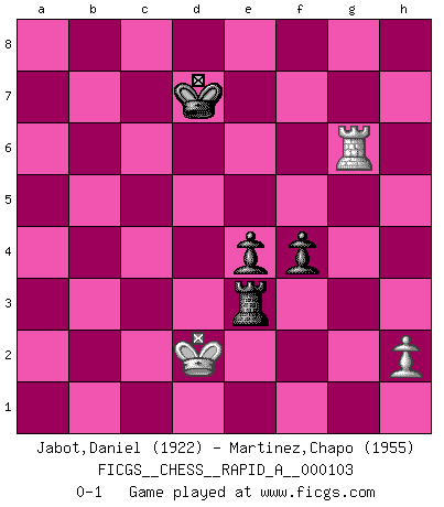 Last move : 0-1 2011 August 3 20:44:2 [Event "FICGS__CHESS__RAPID_A__000103"] [Site "FICGS"] [Date "2011.04.17"] [Round "1"] [White "Jabot,Daniel"] [Black "Martinez,Chapo"] [Result "0-1"] [WhiteElo "1922"] [BlackElo "1955"] 1.e4 c5 2.Nf3 d6 3.d4 cxd4 4.Nxd4 Nf6 5.Nc3 a6 6.Bg5 e6 7.f4 Qb6 8.Qd2 Qxb2 9.Rb1 Qa3 10.e5 dxe5 11.fxe5 Nfd7 12.Ne4 Qxa2 13.Rb3 h6 14.Qc3 Nc6 15.Nxc6 hxg5 16.Na7 Qa4 17.Bd3 Rh4 18.Nd6+ Bxd6 19.exd6 Qf4 20.Kd1 Qxd6 21.Nxc8 Qc5 22.Qxc5 Nxc5 23.Nb6 Rd8 24.g3 Re4 25.Rb2 Nxd3 26.cxd3 Rxd3+ 27.Kc1 Rc3+ 28.Kb1 f5 29.Rc1 Rxc1+ 30.Kxc1 Ke7 31.Kd2 e5 32.Nd5+ Ke6 33.Nc7+ Kd7 34.Rxb7 Kc6 35.Ra7 Kb6 36.Rxa6+ Kxc7 37.Rg6 f4 38.Kd3 Re3+ 39.Kd2 Re4 40.Kd3 Re3+ 41.Kd2 e4 42.Rxg7+ Kd6 43.Rg6+ Kd7 44.gxf4 gxf4 0-1 Sicilian : Najdorf, 7...Qb6 10 pieces endgame at move 36 : White KRPP , Black KRPPPP WHITE : King + 1 Rook 2 Pawns BLACK : King + 1 Rook 4 Pawns 9 pieces endgame at move 42 : White KRPP , Black KRPPP WHITE : King + 1 Rook 2 Pawns BLACK : King + 1 Rook 3 Pawns 8 pieces endgame at move 44 : White KRPP , Black KRPP WHITE : King + 1 Rook 2 Pawns BLACK : King + 1 Rook 2 Pawns 7 pieces endgame at move 44 : White KRP , Black KRPP WHITE : King + 1 Rook 1 Pawn BLACK : King + 1 Rook 2 Pawns Player Black won this chess game. Follow this game move after move (download)Chess is the gymnasium of the mind. (Blaise Pascal) Kasparov ist eine Art Monster mit hundert Augen, denen auch nicht das Geringste entgeht. (Tony Miles) Un buen jugador siempre tiene buena suerte. (José Raúl Capablanca) L'ordinateur a tué l'originalité. Il n'y a plus guère d'aventures sur l'échiquier. (Jacob Murray) O divine art of subtlety and secrecy! Through you we learn to be invisible, through you inaudible and hence we can hold the enemy's fate in our hands. (Sun Tzu)