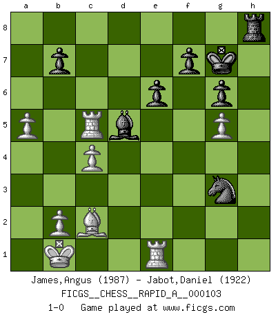 Last move : 1-0 2011 September 18 10:30:46 [Event "FICGS__CHESS__RAPID_A__000103"] [Site "FICGS"] [Date "2011.04.17"] [Round "1"] [White "James,Angus"] [Black "Jabot,Daniel"] [Result "1-0"] [WhiteElo "1987"] [BlackElo "1922"] 1.e4 c5 2.Nf3 d6 3.d4 cxd4 4.Nxd4 Nf6 5.Nc3 g6 6.Be3 Bg7 7.f3 O-O 8.Qd2 Nc6 9.Bc4 Bd7 10.O-O-O Rc8 11.Bb3 Nxd4 12.Bxd4 a5 13.a4 Qe8 14.Qd3 Rb8 15.e5 dxe5 16.Bxe5 Rc8 17.g4 Bc6 18.Rhe1 e6 19.Bd6 Qd7 20.Bxf8 Rxf8 21.g5 Qxd3 22.Rxd3 Nh5 23.h4 Nf4 24.Rd2 h6 25.Ne4 Be5 26.Nd6 Bxd6 27.Rxd6 Ng2 28.Rh1 Kg7 29.Rd2 Nf4 30.Re1 Rh8 31.Re5 hxg5 32.hxg5 Rh1+ 33.Rd1 Rh4 34.Rxa5 Bxf3 35.Rf1 Ne2+ 36.Kd2 Bh5 37.Re5 Ng3 38.Rg1 Ne4+ 39.Kc1 Bf3 40.a5 Nd6 41.c3 Rh8 42.Rf1 Bc6 43.Rd1 Ne4 44.Bc2 Nf2 45.Rf1 Ng4 46.Rc5 Ne3 47.Re1 Ng2 48.Rg1 Nf4 49.Rf1 Ne2+ 50.Kb1 Ng3 51.Re1 Bd5 52.c4 1-0 This chess game has been lost on time (started : 2011.04.17 11:46:32) Sicilian : Dragon, Yugoslav attack, 7...O-O Kingside Castling by player Black (move 7) Queenside Castling by player White (move 10) Player White won this chess game. Follow this game move after move (download)In Fischer's hands, a slight theoretical advantage is as good a being a Queen ahead. (Isaac Kashdan) Wenn Dein Gegner dir ein Remis anbietet, versuch herauszufinden, weshalb er glaubt schlechter zu stehen. (Nigel Short) Los errores estan ahí, esperando a que se cometan. (Savielly Tartakower) Il vaut toujours mieux jouer un plan faux de façon logique que de n'avoir pas de plan du tout. (Victor Kortchnoï) Establishing goals is all right if you don't let them deprive you of interesting detours. (Doug Larson)