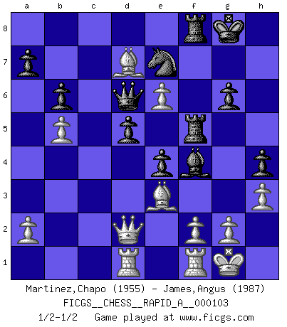 Last move : 1/2-1/2 2011 June 12 13:5:53 [Event "FICGS__CHESS__RAPID_A__000103"] [Site "FICGS"] [Date "2011.04.17"] [Round "1"] [White "Martinez,Chapo"] [Black "James,Angus"] [Result "1/2-1/2"] [WhiteElo "1955"] [BlackElo "1987"] 1.d4 Nf6 2.c4 g6 3.Nc3 Bg7 4.e4 d6 5.Nf3 O-O 6.Be2 e5 7.O-O Nc6 8.d5 Ne7 9.b4 Nh5 10.Re1 f5 11.Ng5 Nf6 12.Bf3 c6 13.Be3 h6 14.Ne6 Bxe6 15.dxe6 fxe4 16.Nxe4 Nxe4 17.Bxe4 d5 18.cxd5 cxd5 19.Bc2 b6 20.Qg4 e4 21.Rad1 Qc7 22.Ba4 Rf5 23.Bd7 h5 24.Qe2 Qd6 25.Qd2 Be5 26.h3 Raf8 27.b5 h4 28.Rf1 Bh2+ 29.Kh1 Bf4 30.Kg1 Bh2+ 31.Kh1 Bf4 32.Kg1 1/2-1/2 King's Indian : Orthodox, Aronin-Taimanov variation (Yugoslav attack / Mar del Plata variation) Kingside Castling by player Black (move 5) Kingside Castling by player White (move 7) This chess game ended in a draw. Follow this game move after move (download)Every Pawn is a potential Queen. (James Mason) Die westlichen Werte sind eine Sprache, welche die Putin-Administration nicht versteht. (Garry Kasparov) En el Ajedrez, tal como en la vida, las bendiciones de hoy pueden ser el veneno del mañana. (Assaic) 'L'échange des dames est un coup dur pour les deux adversaires...' Un journaliste lors d'une partie du match Spassky-Fischer It's only after you lost everything, Tyler says, that you're free to do anything. (Chuck Palahniuk, Fight Club)