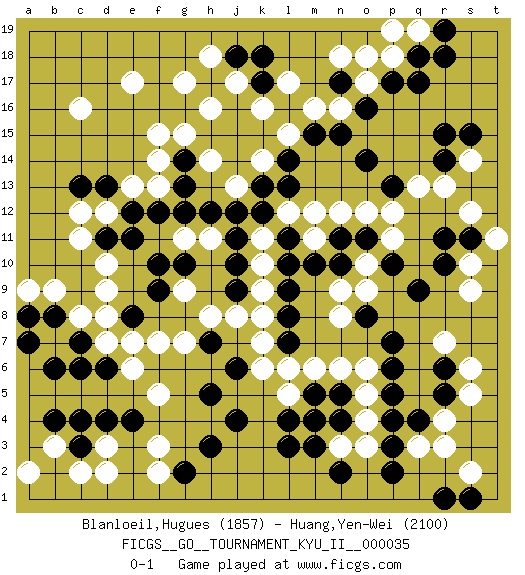 Last move : 0-1 2011 May 24 14:43:11 [Event "FICGS__GO__TOURNAMENT_KYU_II__000035"] [Site "FICGS"] [Date "2011.04.17"] [Round "1"] [Black "Blanloeil,Hugues"] [White "Huang,Yen-Wei"] [Result "0-1"] [Rating 1 "1857"] [Rating 2 "2100"] 1.q17 r4 2.d4 c16 3.r15 e17 4.p3 m4 5.p5 r7 6.j4 q3 7.q4 r3 8.r5 s5 9.r6 s6 10.n4 n3 11.n5 o3 12.p2 o4 13.p4 o5 14.p6 o6 15.p7 n8 16.o8 n9 17.q9 s9 18.r10 s10 19.r11 f3 20.c6 f5 21.j6 d2 22.c3 f7 23.h3 j8 24.h7 d7 25.c7 h8 26.l3 d9 27.l7 m6 28.m3 o9 29.m5 l5 30.l4 n6 31.m4 l6 32.n2 k16 33.n17 c8 34.d13 f13 35.e11 c11 36.f12 d12 37.g13 f14 38.h12 g11 39.g12 g15 40.k12 m12 41.j10 k7 42.l10 o12 43.l14 m16 44.m15 n16 45.o14 o17 46.n15 n18 47.p13 g7 48.h5 c2 49.d6 e6 50.b8 b9 51.a7 p18 52.q18 s12 53.s11 t11 54.e8 d8 55.f9 g9 56.f10 e7 57.d11 c12 58.g14 f15 59.h17 h16 60.k18 j17 61.j18 h18 62.k17 g17 63.l16 l17 64.o16 l15 65.p17 o18 66.g2 k14 67.l13 f2 68.s1 s2 69.r1 b3 70.b4 d3 71.c4 a2 72.b6 a9 73.a8 s14 74.s15 r13 75.r14 q19 76.r19 p19 77.r18 h11 78.j11 j13 79.j12 h14 80.e12 e13 81.c13 d10 82.l8 k6 83.e4 k9 84.l9 l12 85.k13 k10 86.l11 k11 87.n11 n12 88.o11 m11 89.m10 p11 90.p10 o10 91.n10 p12 92.j9 k8 93.g10 q13 0-1 Here are the names of the openings (joseki) played in the four corners : Corner q4 : r4 p3 Komoku (Somok, Xiao~mu`) 3-4 Point. The komoku (3-4) point is the traditional corner enclosure move.. Ikken Kakari (Hankan Keolch'im, Yi Gua`jiao~, 1-Space Low Pincer). The small knight move is the basic approach move to the 3-4 point stone. It has been continually used for over four centuries. There are limitless variations, with new moves constantly being discovered. Black 2 opens the door to a treaure store of joseki. Player White won this Go (weiqi, baduk) game. Follow this game move after move (download)Do not fear furikawari. (Anonymous) Hold em is to stud what chess is to checkers. (Johnny Moss)