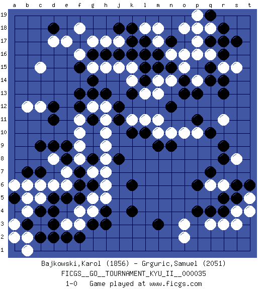 Last move : 1-0 2011 August 19 18:14:55 [Event "FICGS__GO__TOURNAMENT_KYU_II__000035"] [Site "FICGS"] [Date "2011.04.17"] [Round "1"] [Black "Bajkowski,Karol"] [White "Grguric,Samuel"] [Result "1-0"] [Rating 1 "1856"] [Rating 2 "2051"] 1.q17 r15 2.r13 r17 3.r18 q16 4.s17 p17 5.r16 q18 6.r17 p16 7.r14 c15 8.m16 m17 9.l17 n16 10.m15 m18 11.k16 d17 12.n15 o18 13.q19 o15 14.n17 o16 15.o14 p14 16.p13 s15 17.q14 l18 18.k18 p18 19.q15 p19 20.q4 e3 21.c4 o3 22.g3 g4 23.h3 f4 24.h4 c6 25.d5 d6 26.e5 e6 27.f5 g5 28.f6 d8 29.m3 h5 30.k4 g7 31.f7 f8 32.g6 h6 33.g8 h7 34.e8 f9 35.e9 e7 36.d9 c5 37.d4 b4 38.b3 b5 39.d2 b2 40.c2 a3 41.e2 c3 42.d3 f10 43.d11 h9 44.j8 h8 45.c9 c12 46.b7 b1 47.a5 b6 48.c7 a6 49.b3 a2 50.d12 b12 51.f12 r6 52.r8 r3 53.r4 q3 54.p4 o2 55.q7 s4 56.s5 s3 57.r5 q6 58.p6 s8 59.r9 h12 60.g11 h10 61.h13 g12 62.g13 h11 63.f13 t5 64.t6 t4 65.s6 f3 66.f2 o10 67.n9 n10 68.m9 m10 69.k10 k11 70.l10 l11 71.n12 m11 72.k6 r11 73.p11 p10 74.q10 j17 75.k17 n14 76.o13 g17 77.d18 j15 78.k13 k14 79.j12 l13 80.j11 f11 81.l14 m14 82.l15 k15 83.l16 m13 84.j16 h15 85.h16 g15 86.g16 f16 87.f17 h17 88.j18 f18 89.f15 e17 90.g14 1-0 Here are the names of the openings (joseki) played in the four corners : Corner q16 : q17 r15 Komoku (Somok, Xiao~mu`) 3-4 Point. The komoku (3-4) point is the traditional corner enclosure move.. Ikken Kakari (Hankan Keolch'im, Yi Gua`jiao~, 1-Space Low Pincer). The small knight move is the basic approach move to the 3-4 point stone. It has been continually used for over four centuries. There are limitless variations, with new moves constantly being discovered. White 2 opens the door to a treaure store of joseki. Corner d4 : e3 c4 Mokuhazushi (Waemok, Wai`mu`) 5-3 Point. The mokuhazushi (5-3) point was popular in the Edo period in Japan (1600 - 1867). It emphasizes influence; territorially, it is inferior to the 3-4 point. Komoku Kakari. Black 2 is the standard approach because of its solidity and stability. Corner q4 : q4 o3 Hoshi (Hwajeom, Seongjeom, Xingwei`) 4-4 Point. The star or hoshi (4-4) point, emphasizing influence at the potential expense of territory. Ikken Kakari (Hankan Keolch'im, Yi Gua`jiao~, 1-Space Low Approach). White 2 is the standard approach move to the 4-4. Player Black won this Go (weiqi, baduk) game. Follow this game move after move (download)Go is to western chess what philosophy is to double entry accounting. (from Shibumi, by Trevanian) A proverb is a short sentence based on long experience. (Miguel de Cervantes)