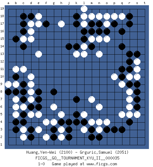 Last move : 1-0 2011 April 25 21:12:7 [Event "FICGS__GO__TOURNAMENT_KYU_II__000035"] [Site "FICGS"] [Date "2011.04.17"] [Round "1"] [Black "Huang,Yen-Wei"] [White "Grguric,Samuel"] [Result "1-0"] [Rating 1 "2100"] [Rating 2 "2051"] 1.q16 d16 2.q3 e3 3.r9 o17 4.q14 q18 5.r17 l17 6.k4 m4 7.o3 l5 8.k5 m7 9.m3 l3 10.l4 n3 11.m2 n4 12.n2 o4 13.p3 n6 14.g3 q5 15.c4 g4 16.h4 f4 17.c7 h3 18.j3 h2 19.g2 h5 20.j4 g6 21.k7 q9 22.q10 r10 23.r11 s10 24.s9 s11 25.r12 s12 26.r13 r8 27.s8 r7 28.s7 p10 29.q11 r6 30.s6 s5 31.r4 r5 32.s13 d10 33.f17 h17 34.c17 d17 35.c16 d15 36.d18 e18 37.c18 e17 38.c14 e13 39.m16 n15 40.m17 l14 41.k17 l18 42.l16 m18 43.k14 k13 44.m14 m15 45.l15 l13 46.o16 o15 47.n16 n13 48.k18 n18 49.p17 p18 50.n17 o18 51.r18 l19 52.j14 f2 53.j2 c3 54.b3 b5 55.d3 c2 56.b4 c6 57.d6 b7 58.c8 d7 59.c5 b6 60.b8 d5 61.e6 e5 62.e7 d8 63.e8 d9 64.b10 c15 65.b15 b11 66.d2 b9 67.c9 a9 68.a8 c11 69.g8 1-0 Here are the names of the openings (joseki) played in the four corners : Corner q16 : q16 o17 Hoshi (Hwajeom, Seongjeom, Xingwei`) 4-4 Point. The star or hoshi (4-4) point, emphasizing influence at the potential expense of territory. Ikken Kakari (Hankan Keolch'im, Yi Gua`jiao~, 1-Space Low Approach). White 2 is the standard approach move to the 4-4. Corner d4 : e3 g3 Mokuhazushi (Waemok, Wai`mu`) 5-3 Point. The mokuhazushi (5-3) point was popular in the Edo period in Japan (1600 - 1867). It emphasizes influence; territorially, it is inferior to the 3-4 point. Corner d16 : d16 f17 Hoshi (Hwajeom, Seongjeom, Xingwei`) 4-4 Point. The star or hoshi (4-4) point, emphasizing influence at the potential expense of territory. Ikken Kakari (Hankan Keolch'im, Yi Gua`jiao~, 1-Space Low Approach). Black 2 is the standard approach move to the 4-4. Player Black won this Go (weiqi, baduk) game. Follow this game move after move (download)Win the stones, lose the game. (Anonymous) The bottom line is always the bottom line. (Johann Piek)