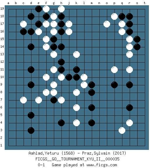 Last move : 0-1 2011 August 2 0:54:38 [Event "FICGS__GO__TOURNAMENT_KYU_II__000035"] [Site "FICGS"] [Date "2011.04.17"] [Round "1"] [Black "Aahlad,Yeturu"] [White "Praz,Sylvain"] [Result "0-1"] [Rating 1 "1568"] [Rating 2 "2017"] 1.d3 q16 2.d16 q3 3.d5 k4 4.r6 r4 5.r9 r11 6.p9 p11 7.h4 f17 8.m4 k6 9.h17 f15 10.d14 j16 11.e17 j17 12.f18 c7 13.r17 q17 14.r16 r15 15.s15 r14 16.s14 r13 17.q18 p18 18.r18 o17 19.d9 e7 20.g7 f8 21.m6 k8 22.m8 g8 23.d11 h7 24.k10 l9 25.m9 l10 26.k11 g11 27.g10 h10 28.h11 f10 29.j10 g9 30.h12 k13 31.h14 g13 32.g14 f14 33.h16 c17 34.c16 e18 35.d18 g18 36.e19 g17 37.h18 h19 38.f16 g16 39.g15 e16 40.g19 f19 0-1 Here are the names of the openings (joseki) played in the four corners : Corner q4 : q3 r6 Komoku (Somok, Xiao~mu`) 3-4 Point. The komoku (3-4) point is the traditional corner enclosure move.. Niken Kakari (Dukan Keolch'im, E`r Gua`jiao~, 2-Space Low Approach). Black 2 is used with friendly forces backing it up. Its purpose is to prevent a pincer. Locally it results in a loss, but may be appropriate fuseki strategy. It was popular in the late 1950s and early 1960s, but is not seen often nowadays, having been replaced by the one-space high approach, with which it has points in common. Corner d16 : d16 f17 Hoshi (Hwajeom, Seongjeom, Xingwei`) 4-4 Point. The star or hoshi (4-4) point, emphasizing influence at the potential expense of territory. Ikken Kakari (Hankan Keolch'im, Yi Gua`jiao~, 1-Space Low Approach). White 2 is the standard approach move to the 4-4. Player White won this Go (weiqi, baduk) game. Follow this game move after move (download)In an unreasonable situation, an unreasonable move is reasonable. (Tamino) Good decisions come from experience, and experience comes from bad decisions. (Anonymous)
