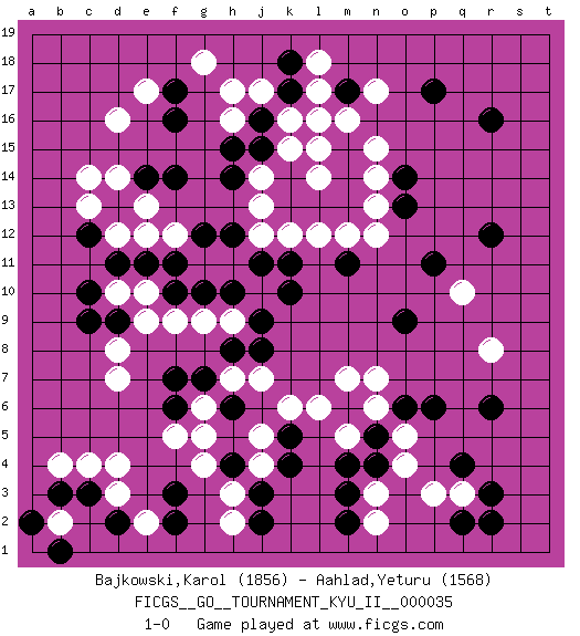 Last move : 1-0 2011 October 18 2:10:14 [Event "FICGS__GO__TOURNAMENT_KYU_II__000035"] [Site "FICGS"] [Date "2011.04.17"] [Round "1"] [Black "Bajkowski,Karol"] [White "Aahlad,Yeturu"] [Result "1-0"] [Rating 1 "1856"] [Rating 2 "1568"] 1.r16 d4 2.q4 d16 3.p17 q10 4.r12 k16 5.k4 d10 6.f3 o4 7.r6 q3 8.r3 p3 9.r2 d7 10.f17 e17 11.f16 d14 12.m17 h16 13.f14 j13 14.d13 e13 15.e14 c14 16.h14 j14 17.n5 e12 18.g12 h11 19.f10 g11 20.h12 j12 21.h15 g18 22.j15 k15 23.j16 j17 24.k17 h17 25.f11 f12 26.j11 j10 27.k11 h9 28.k14 l14 29.k13 k12 30.l13 l12 31.m13 l17 32.k18 l18 33.l16 l15 34.m15 m16 35.m14 l16 36.m11 m12 37.k10 n12 38.h10 n15 39.o14 n14 40.o13 n13 41.n4 n6 42.m6 m7 43.j9 o5 44.o6 n7 45.p6 m5 46.m4 l6 47.d9 e9 48.d11 d12 49.c10 e10 50.e11 d8 51.c9 g9 52.g10 e2 53.f2 f9 54.c12 c13 55.f7 g6 56.f6 f5 57.g7 h7 58.h6 g5 59.h8 j7 60.j8 h3 61.c3 n3 62.m3 n2 63.h4 g4 64.m2 j4 65.j2 h2 66.j3 j5 67.k5 k6 68.q2 c4 69.d2 b2 70.b3 b4 71.a2 d3 72.b1 n17 73.p11 r8 74.o9 1-0 Here are the names of the openings (joseki) played in the four corners : Corner d4 : d4 f3 Hoshi (Hwajeom, Seongjeom, Xingwei`) 4-4 Point. The star or hoshi (4-4) point, emphasizing influence at the potential expense of territory. Ikken Kakari (Hankan Keolch'im, Yi Gua`jiao~, 1-Space Low Approach). Black 2 is the standard approach move to the 4-4. Corner q4 : q4 o4 Hoshi (Hwajeom, Seongjeom, Xingwei`) 4-4 Point. The star or hoshi (4-4) point, emphasizing influence at the potential expense of territory. Ikken Takagakari (Hankan Nop'dakeolch'im, Yi Gaojia, 1-Space High Approach). Black typically responds at 6-4 or 3-10. Black 4-10 is played when Black finds play on the right side advantageous. Black 4-8 or 3-8 may be played when Black has support at top. Corner d16 : d16 f17 Hoshi (Hwajeom, Seongjeom, Xingwei`) 4-4 Point. The star or hoshi (4-4) point, emphasizing influence at the potential expense of territory. Ikken Kakari (Hankan Keolch'im, Yi Gua`jiao~, 1-Space Low Approach). Black 2 is the standard approach move to the 4-4. Player Black won this Go (weiqi, baduk) game. Follow this game move after move (download)Don't count territory held by only one eye. (Anonymous) Before all elsed, be armed. (Niccolo Machiavelli)