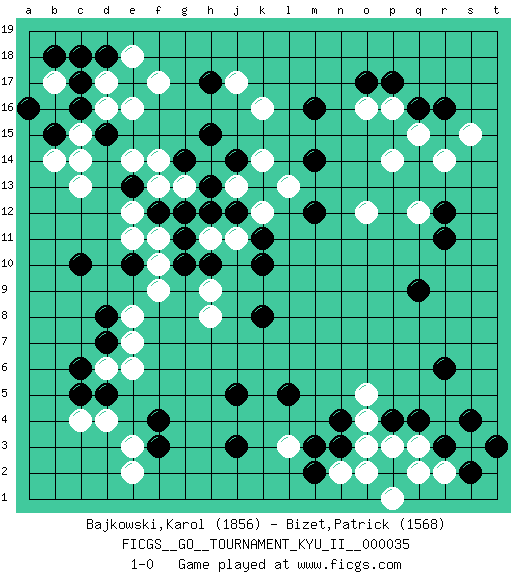 Last move : 1-0 2011 September 7 21:32:6 [Event "FICGS__GO__TOURNAMENT_KYU_II__000035"] [Site "FICGS"] [Date "2011.04.17"] [Round "1"] [Black "Bajkowski,Karol"] [White "Bizet,Patrick"] [Result "1-0"] [Rating 1 "1856"] [Rating 2 "1568"] 1.q16 d4 2.q4 d16 3.c10 k16 4.c6 d6 5.d7 e6 6.c5 c4 7.f3 e3 8.f4 l3 9.j3 o3 10.d5 e2 11.r6 e7 12.d8 c13 13.m16 r14 14.r12 p14 15.q9 o16 16.o17 p16 17.p17 q15 18.r16 o5 19.j5 e8 20.e10 h8 21.l5 q2 22.r3 k14 23.k8 h9 24.k10 h11 25.m14 q12 26.r11 o12 27.n4 o4 28.n3 n2 29.m2 o2 30.m3 r2 31.s2 s3 32.s4 q3 33.t3 p1 34.p4 p3 35.h17 j17 36.h15 k12 37.m12 s15 38.c17 d17 39.c16 c15 40.d18 e18 41.b15 b14 42.e17 e16 43.d15 c14 44.c18 f17 45.a16 b17 46.b18 e12 47.f12 f13 48.g12 e11 49.g10 f10 50.e13 e14 51.h10 f9 52.h12 j11 53.k13 j13 54.j12 l13 55.k11 f11 56.g11 g13 57.h13 h14 58.g14 f14 59.j14 1-0 Here are the names of the openings (joseki) played in the four corners : Corner d4 : d4 c6 Hoshi (Hwajeom, Seongjeom, Xingwei`) 4-4 Point. The star or hoshi (4-4) point, emphasizing influence at the potential expense of territory. Ikken Kakari (Hankan Keolch'im, Yi Gua`jiao~, 1-Space Low Approach). Black 2 is the standard approach move to the 4-4. Corner q4 : q4 l3 Hoshi (Hwajeom, Seongjeom, Xingwei`) 4-4 Point. The star or hoshi (4-4) point, emphasizing influence at the potential expense of territory. Player Black won this Go (weiqi, baduk) game. Follow this game move after move (download)The possibility or impossibility of an event results logically from the rules. (Pierre Audouard) Better than a thousand days of diligent study is one day with a great teacher. (Japanese proverb)