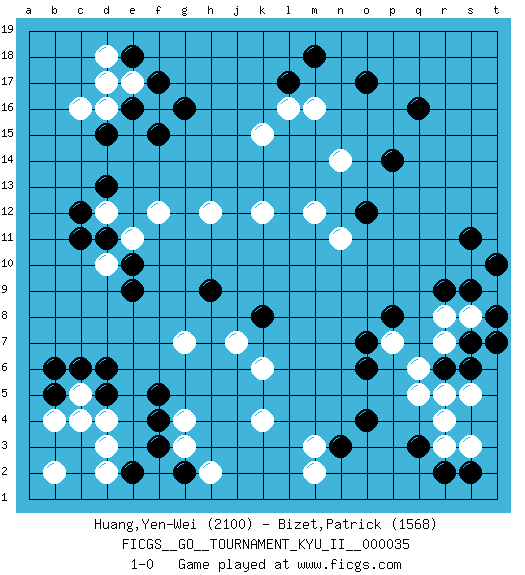 Last move : 1-0 2011 August 11 16:15:0 [Event "FICGS__GO__TOURNAMENT_KYU_II__000035"] [Site "FICGS"] [Date "2011.04.17"] [Round "1"] [Black "Huang,Yen-Wei"] [White "Bizet,Patrick"] [Result "1-0"] [Rating 1 "2100"] [Rating 2 "1568"] 1.q16 d4 2.q3 d16 3.r9 d10 4.f3 q5 5.o4 r3 6.r2 r4 7.s2 r7 8.f5 k4 9.d6 c5 10.c6 d3 11.b5 b4 12.d5 c4 13.o6 k6 14.p8 s8 15.k8 j7 16.h9 g7 17.e9 g4 18.f4 g3 19.g2 h2 20.e2 d2 21.e10 d12 22.d11 e11 23.c11 f12 24.c12 h12 25.d13 k12 26.f17 f16 27.g16 e17 28.f15 m12 29.e16 d18 30.d15 c16 31.e18 d17 32.o17 k15 33.s9 t9 34.s11 s3 35.o12 n14 36.p14 m16 37.m18 m3 38.n3 m2 39.b6 b2 40.l17 l16 41.t10 n11 42.s6 s5 43.r6 q6 44.s7 r8 45.t8 p7 46.o7 r5 47.t7 1-0 Here are the names of the openings (joseki) played in the four corners : Corner d4 : d4 f3 Hoshi (Hwajeom, Seongjeom, Xingwei`) 4-4 Point. The star or hoshi (4-4) point, emphasizing influence at the potential expense of territory. Ikken Kakari (Hankan Keolch'im, Yi Gua`jiao~, 1-Space Low Approach). Black 2 is the standard approach move to the 4-4. Corner q16 : q16 m12 Hoshi (Hwajeom, Seongjeom, Xingwei`) 4-4 Point. The star or hoshi (4-4) point, emphasizing influence at the potential expense of territory. Player Black won this Go (weiqi, baduk) game. Follow this game move after move (download)Everything would seem to be possible in Go. Like pulling a rabbit, by a magical move, out of a hat. (Pierre Audouard) Vladimir Ras-Putin is still alive... He is also a good actor, I saw him in the Lord of the Rings. (Rodolfo d'Ettorre)