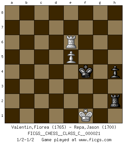 Last move : 1/2-1/2 2007 March 4 17:24:17 [Event "FICGS__CHESS__CLASS_C__000021"] [Site "FICGS"] [Date "2006.12.17"] [Round "1"] [White "Valentin,Florea"] [Black "Repa,Jason"] [Result "1/2-1/2"] [WhiteElo "1765"] [BlackElo "1700"] 1.e4 e6 2.d4 d5 3.Nc3 Nf6 4.e5 Nfd7 5.f4 c5 6.Nf3 Nc6 7.Be3 cxd4 8.Nxd4 Qb6 9.Qd2 Qxb2 10.Rb1 Qa3 11.Bb5 Nxd4 12.Bxd4 Bb4 13.O-O O-O 14.Rb3 Qa5 15.Qe3 Nb6 16.Bd3 Nc4 17.Bxc4 dxc4 18.Rxb4 Qxb4 19.Bc5 Qa5 20.Bxf8 Kxf8 21.Rd1 Qb6 22.Qxb6 axb6 23.Rd8+ Ke7 24.Rg8 Ra3 25.Nb5 Ra5 26.Nd6 Bd7 27.Rxg7 Be8 28.Rg8 Bd7 29.Nxc4 Rxa2 30.Nxb6 Rxc2 31.Nxd7 Kxd7 32.Rg7 b5 33.Rxf7+ Kc6 34.Rf8 Kd5 35.Rb8 Rb2 36.Kf1 b4 37.Ke1 Rxg2 38.Rxb4 Rxh2 39.Rb6 h5 40.Rd6+ Ke4 41.Rxe6 Kxf4 42.Kf1 h4 1/2-1/2 French : Steinitz, Boleslavsky variation Kingside Castling by player White (move 13) Kingside Castling by player Black (move 13) 10 pieces endgame at move 37 : White KRPPP , Black KRPPP WHITE : King + 1 Rook 3 Pawns BLACK : King + 1 Rook 3 Pawns 9 pieces endgame at move 38 : White KRPPP , Black KRPP WHITE : King + 1 Rook 3 Pawns BLACK : King + 1 Rook 2 Pawns 8 pieces endgame at move 38 : White KRPP , Black KRPP WHITE : King + 1 Rook 2 Pawns BLACK : King + 1 Rook 2 Pawns 7 pieces endgame at move 41 : White KRPP , Black KRP WHITE : King + 1 Rook 2 Pawns BLACK : King + 1 Rook 1 Pawn 6 pieces endgame at move 41 : White KRP , Black KRP WHITE : King + 1 Rook 1 Pawn BLACK : King + 1 Rook 1 Pawn This chess game ended in a draw. Follow this game move after move (download)Chess demands total concentration. (Bobby Fischer) Ich verachte die Medien. (Robert James Fischer) Mis oponentes también hacen buenas movidas. A veces yo no tomo esas cosas en consideración. (Bobby Fischer) Pour se monter efficace, un Cavalier a besoin d'avant-postes ! Les Cavaliers font les meilleurs bloqueurs de pions passés. There's no money in correspondence chess. (John Knudsen)