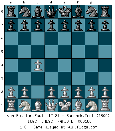 Last move : 1-0 2011 May 18 18:18:15 [Event "FICGS__CHESS__RAPID_B__000180"] [Site "FICGS"] [Date "2011.04.17"] [Round "1"] [White "von Buttlar,Paul"] [Black "Baranek,Toni"] [Result "1-0"] [WhiteElo "1718"] [BlackElo "1800"] 1.c4 1-0 This chess game has been lost on time (started : 2011.04.17 14:41:17) English Opening Player White won this chess game. Follow this game move after move (download)A player surprised is half beaten. (Proverb) Ich bin stolz ein Bulgare zu sein. (Veselin Topalov) Todos los Maestros de Ajedrez fueron un día unos principiantes. (Chernev) Aidez vos pièces, elles vous aideront. (Paul Morphy) A good aphorism is too hard for the tooth of time, and is not worn away with the centuries, although it serves as food for every speech. (Friedrich Nietzsche)
