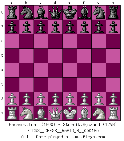 Last move : 0-1 2011 May 17 18:12:57 [Event "FICGS__CHESS__RAPID_B__000180"] [Site "FICGS"] [Date "2011.04.17"] [Round "1"] [White "Baranek,Toni"] [Black "Sternik,Ryszard"] [Result "0-1"] [WhiteElo "1800"] [BlackElo "1798"] 0-1 This chess game has been lost on time (started : 2011.04.17 14:41:17) Player Black won this chess game. Follow this game move after move (download)Blessed be the memory of him who gave the world this immortal game. (A. G. Gardiner) Es ist nicht das erste mal, dass sich die FIDE dem Arabischen Geld gebeugt hat (über die FIDE WM 2004 in Lybien). (Larry Evans) El Ajedrez es un terrible juego. Si no controlas el centro, tu oponente tiene una posición mas holgada. Si tienes control del centro, ¡entonces realmente tu tienes algo de que preocuparte!. (Siegbert Tarrasch) Il a essayé de se convaincre qu'il pourrait empêcher toutes les erreurs et ne jamais perdre. L'horreur ! Gary Kasparov au sujet de Robert Fischer. Wikichess, chess moves explained by 'experimented' players. (Thibault de Vassal)