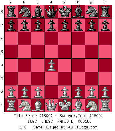 Last move : 1-0 2011 May 18 18:18:15 [Event "FICGS__CHESS__RAPID_B__000180"] [Site "FICGS"] [Date "2011.04.17"] [Round "1"] [White "Ilic,Petar"] [Black "Baranek,Toni"] [Result "1-0"] [WhiteElo "1800"] [BlackElo "1800"] 1.d4 1-0 This chess game has been lost on time (started : 2011.04.17 14:41:17) Queen's pawn Player White won this chess game. Follow this game move after move (download)With or without the title, Bobby Fischer was unquestionably the greatest player of his time. (Burt Hochberg) Offener Brief an US-Präsident Bush anlässlich der Verhaftung Bobby Fishers: Verhaften Sie mich. Stecken Sie mich in dieselbe Zelle wie Bobby Fisher und geben Sie uns ein Schachspiel mit. (Boris Vassilievich Spassky) El jugador de combinación piensa hacia adelante; comienza de la posición dada y trabaja las movidas contundentes en su mente. (Emanuel Lasker) Karpov est une pièce de musée. (Garry Kasparov) There's no money in correspondence chess. (John Knudsen)