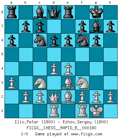 Last move : 1-0 2011 June 12 7:35:55 [Event "FICGS__CHESS__RAPID_B__000180"] [Site "FICGS"] [Date "2011.04.17"] [Round "1"] [White "Ilic,Petar"] [Black "Ezhov,Sergey"] [Result "1-0"] [WhiteElo "1800"] [BlackElo "1800"] 1.d4 d6 2.e4 Nf6 3.Nc3 g6 4.Be3 Bg7 5.Qd2 O-O 6.Nf3 e6 7.Be2 Re8 8.O-O Nc6 9.Rad1 a6 10.a3 1-0 This chess game has been lost on time (started : 2011.04.17 14:41:17) Queen's Pawn Kingside Castling by player Black (move 5) Kingside Castling by player White (move 8) Player White won this chess game. Follow this game move after move (download)The hallmark of the artist is simplicity. (Larry Evans) Sie bekommen vielleicht den Eindruck, dass die Spitzenspieler überhaupt gar nicht so stark sind. Aber das stimmt nicht. Es ist eine Illusion. Mit einem Computer an der Seite ist es sehr leicht, Urteile zu fällen, aber wenn man alleine am Brett sitzt, sieht die Sache ganz anders aus. (Vladimir Kramnik) Puntos débiles o agujeros en la posición de tu oponente deben de ser ocupados por piezas, no Peones. (Siegbert Tarrasch) Les échecs sont plus proches de l'art de l'assassinat que de l'art de la guerre. (Arturo Perez-Reverte) Be who you are, and say what you feel because those who mind don't matter, and those who matter don't mind. (Dr Seuss)