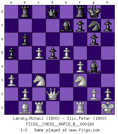 Last move : 1-0 2011 August 26 22:3:15 [Event "FICGS__CHESS__RAPID_B__000180"] [Site "FICGS"] [Date "2011.04.17"] [Round "1"] [White "Larsky,Mihail"] [Black "Ilic,Petar"] [Result "1-0"] [WhiteElo "1800"] [BlackElo "1800"] 1.d4 Nf6 2.c4 e6 3.Nc3 Bb4 4.f3 Nc6 5.e4 d5 6.cxd5 exd5 7.e5 Ng8 8.Be3 Nge7 9.f4 O-O 10.Nf3 Na5 11.Qc1 c6 12.Be2 Nc4 13.O-O Nxe3 14.Qxe3 Nf5 15.Qf2 g6 16.Bd3 Be7 17.a3 Bd7 18.Na4 b6 19.Rac1 Rb8 20.Kh1 a5 21.Qd2 Ng7 22.Bb1 c5 23.Nc3 Bg4 24.dxc5 1-0 This chess game has been lost on time (started : 2011.04.17 14:41:17) Nimzo-Indian : Kmoch variation Kingside Castling by player Black (move 9) Kingside Castling by player White (move 13) Player White won this chess game. Follow this game move after move (download)Spassky will not be psyched out by Fischer. (Mike Goodall) Wenn ich Weiß habe gewinne ich weil ich Weiß habe, wenn ich Schwarz habe gewinne ich weil ich Bogoljubov bin. (Efim Bogoljubov) En el tablero, la mentira e hipocresía no sobreviven mucho. (Emanuel Lasker) On entre au jeu d'Echecs comme on entre en Religion. Pour le joueur d'Echecs, la partie d'Echecs c'est l'office, la messe, le défilé du 1er Mai, le dépôt de gerbe au Monument aux Morts. C'est un drame sacré. (Michel Roos) The problem with troubleshooting is that trouble shoots back. (Anonymous)