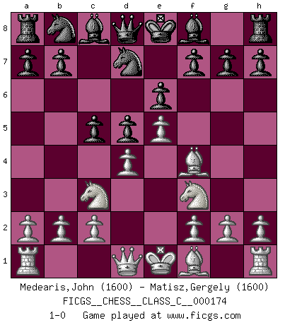 Last move : 1-0 2011 May 30 6:59:30 [Event "FICGS__CHESS__CLASS_C__000174"] [Site "FICGS"] [Date "2011.04.17"] [Round "1"] [White "Medearis,John"] [Black "Matisz,Gergely"] [Result "1-0"] [WhiteElo "1600"] [BlackElo "1600"] 1.e4 e6 2.Nf3 d5 3.Nc3 Nf6 4.e5 Nfd7 5.d4 c5 6.Bf4 1-0 This chess game has been lost on time (started : 2011.04.17 15:4:3) French defense Player White won this chess game. Follow this game move after move (download)When you are lonely, when you feel yourself an alien in the world, play Chess. This will raise your spirits and be your counselor in war. (Aristotle) Gegen einen Schachcomputer zu verlieren ist wie Löcher in den Strümpfen zuhaben. Es ist nicht peinlich, solange man der einzige ist der es weiß. (Anonymous) El Ajedrez no es como la vida... ¡tiene reglas!. (Mark Pasternak) Le thème de l'attaque double intervient d'une manière ou d'une autre dans l'immense majorité des combinaisons. (Youri Averbakh) If only faces could talk... (Pat Summerall, Sportscaster during the Super Bowl)