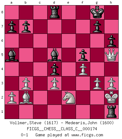 Last move : 0-1 2011 August 22 1:9:51 [Event "FICGS__CHESS__CLASS_C__000174"] [Site "FICGS"] [Date "2011.04.17"] [Round "1"] [White "Vollmer,Steve"] [Black "Medearis,John"] [Result "0-1"] [WhiteElo "1617"] [BlackElo "1600"] 1.Nf3 Nf6 2.c4 c5 3.g3 Nc6 4.Bg2 e5 5.Nc3 d6 6.O-O Be7 7.b3 O-O 8.Bb2 h6 9.d3 Bg4 10.h3 Be6 11.Qd2 Qd7 12.Kh2 Bd8 13.e3 Ba5 14.Ng1 d5 15.cxd5 Nxd5 16.Rfd1 Rad8 17.Nge2 Ndb4 18.Nc1 f5 19.Bxc6 Nxc6 20.f4 Rfe8 21.Qf2 Bf7 22.Qf3 Qe7 23.N1e2 exf4 24.exf4 Nd4 25.Nxd4 cxd4 26.Re1 Qxe1 27.Rxe1 Rxe1 28.Ne2 Bd5 29.Qh5 Rh1+ 0-1 Reti Opening Kingside Castling by player White (move 6) Kingside Castling by player Black (move 7) Player Black won this chess game. Follow this game move after move (download)The Chess pieces are the block alphabet which shapes thoughts; and these thoughts, although making a visual design on the chessboard, express their beauty abstractly, like a poem. (Marcel Duchamp) Aljechin war kein Nazi. Er war ein Opportunist. Ein schrecklicher Mann. Er liebte Geld über alles und würde für Geld ein Jude, ein Katolik oder ein Protestant werden. (Miguel Najdorf) Una clavada es mas poderosa que una espada. (Fred Reinfeld) Karpov est une pièce de musée. (Garry Kasparov) It is the aim of the modern school, not to treat every position according to one general law, but according to the principle inherent in the position. (Richard Reti)