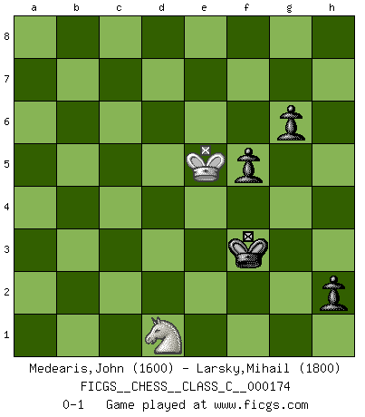 Last move : 0-1 2011 August 24 7:35:45 [Event "FICGS__CHESS__CLASS_C__000174"] [Site "FICGS"] [Date "2011.04.17"] [Round "1"] [White "Medearis,John"] [Black "Larsky,Mihail"] [Result "0-1"] [WhiteElo "1600"] [BlackElo "1800"] 1.d4 Nf6 2.Nf3 e6 3.e3 c5 4.c4 g6 5.Nc3 Bg7 6.dxc5 O-O 7.e4 Qa5 8.Bd2 Qxc5 9.Be2 d5 10.Be3 Qa5 11.exd5 exd5 12.O-O dxc4 13.Nd2 Rd8 14.Nxc4 Rxd1 15.Nxa5 Rxa1 16.Rxa1 Nc6 17.Rd1 Bg4 18.f3 Bxf3 19.Bxf3 Nxa5 20.b4 Nc4 21.Bc5 Bh6 22.Bxb7 Rb8 23.Bf3 Be3+ 24.Bxe3 Nxe3 25.Rd2 Rxb4 26.h3 Kg7 27.Kf2 Nc4 28.Rd4 Rb2+ 29.Be2 Nb6 30.Ke3 h5 31.g3 Rc2 32.Kd3 Rc1 33.Bf3 Re1 34.Kd2 Rg1 35.Ne2 Rb1 36.a4 Nbd7 37.Nc3 Rg1 38.Ne2 Rf1 39.Ke3 Ne5 40.Bg2 Rb1 41.Ba8 Rb3+ 42.Kd2 Rb2+ 43.Ke3 Ra2 44.Nc3 Rh2 45.Kf4 Ned7 46.h4 Nc5 47.Bd5 Rc2 48.Nd1 a5 49.Ke5 Rc1 50.Nf2 Rc3 51.Rc4 Nxd5 52.Kxd5 Rxc4 53.Kxc4 Nxa4 54.Nd1 Kf6 55.Kb5 Kf5 56.Kxa5 Kg4 57.Kxa4 Kxg3 58.Kb4 Kxh4 59.Ne3 f5 60.Kc3 Kg3 61.Kd4 h4 62.Nf1+ Kf2 63.Ne3 h3 64.Nd1+ Kf3 65.Ke5 h2 0-1 Queen's pawn : Yusupov-Rubinstein system Kingside Castling by player Black (move 6) Kingside Castling by player White (move 12) 10 pieces endgame at move 53 : White KNPP , Black KNPPPP WHITE : King + 1 Knight 2 Pawns BLACK : King + 1 Knight 4 Pawns 9 pieces endgame at move 56 : White KNPP , Black KNPPP WHITE : King + 1 Knight 2 Pawns BLACK : King + 1 Knight 3 Pawns 8 pieces endgame at move 57 : White KNPP , Black KPPP WHITE : King + 1 Knight 2 Pawns BLACK : King + 3 Pawns 7 pieces endgame at move 57 : White KNP , Black KPPP WHITE : King + 1 Knight 1 Pawn BLACK : King + 3 Pawns 6 pieces endgame at move 58 : White KN , Black KPPP WHITE : King + 1 Knight BLACK : King + 3 Pawns Player Black won this chess game. Follow this game move after move (download)When in doubt... play Chess ! (Tevis) Schach wird sich dank seiner hohen kulturellen Tradition immer durchsetzen. In näherer Zukunft womöglich sogar als Gegenreaktion auf die maßlose Reizüberflutung im Freizeit- und Spielbereich. (Garry Kasparov) El Ajedrez es tortura mental. (Garry Kasparov) Je fais ceci parce que dans cinquante coups j'obtiendrai cela; je m'appelle Mikhail Moisevitch Botvinnik. (Botvinnik) Whatever you do, don't be bored. This is absolutely the most exciting time we could have possibly hoped to be alive. And things are just starting. (From movie Waking life)