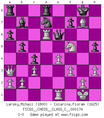 Last move : 1-0 2011 April 22 12:9:20 [Event "FICGS__CHESS__CLASS_C__000174"] [Site "FICGS"] [Date "2011.04.17"] [Round "1"] [White "Larsky,Mihail"] [Black "Colarina,Floram"] [Result "1-0"] [WhiteElo "1800"] [BlackElo "1625"] 1.e4 e5 2.Nf3 Nc6 3.Bb5 a6 4.Ba4 Nf6 5.O-O Be7 6.Re1 b5 7.Bb3 O-O 8.c3 d6 9.h3 Bb7 10.d4 h6 11.Nbd2 Re8 12.Nf1 Na5 13.dxe5 dxe5 14.Nxe5 Nxb3 15.Qxb3 Rf8 16.Ng3 Bd6 17.Bf4 Bxe5 18.Bxe5 Qe7 19.Bd4 Qe6 20.f3 Nd7 21.Nf5 c5 22.Bxg7 c4 23.Qa3 Rfd8 24.Rad1 h5 25.Rd6 1-0 Ruy Lopez : Closed, 7...O-O Kingside Castling by player White (move 5) Kingside Castling by player Black (move 7) Player White won this chess game. Follow this game move after move (download)By this measure (on the gap between Fischer & his contemporaries), I consider him the greatest world champion. (Garry Kasparov) Das Blackmar-Diemer-Gambit verändert den ganzen Menschen! (Emil Joseph Diemer) Realmente no sabemos como el juego fue inventado, aunque hay sospechas. Tan pronto como descubramos a los culpables, se los haremos saber. (Bruce Pandolfini) Je crois qu'il existe des manières très spécifiques de jouer efficacement contre une machine. Evidemment, nous n'avons aucune chance en technique pure, parce que l'ordinateur calcule de manière parfaite. Mais lorsque nous faisons appel à notre cerveau, en utilisant l'intuition et la compréhension, alors nous restons beaucoup plus forts. (Anatoli Karpov) History is the quarrels of popes and kings, with wars or pestilences in every page; the men all so good for nothing, and hardly any women at all. (Jane Austen)