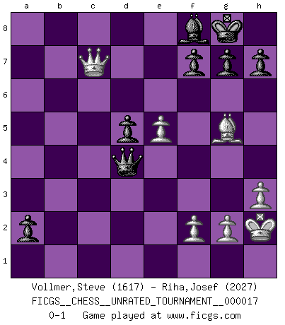 Last move : 0-1 2011 May 25 1:58:19 [Event "FICGS__CHESS__UNRATED_TOURNAMENT__000017"] [Site "FICGS"] [Date "2011.04.18"] [Round "1"] [White "Vollmer,Steve"] [Black "Riha,Josef"] [Result "0-1"] [WhiteElo "1617"] [BlackElo "2027"] 1.e4 e5 2.Nf3 Nc6 3.Bb5 a6 4.Ba4 Nf6 5.O-O Be7 6.Re1 b5 7.Bb3 d6 8.c3 O-O 9.d4 exd4 10.cxd4 d5 11.e5 Ne4 12.Nc3 Nxc3 13.bxc3 Bf5 14.Bf4 Na5 15.Bc2 Bxc2 16.Qxc2 Qd7 17.a4 Nc4 18.axb5 axb5 19.h3 Ra4 20.Rxa4 bxa4 21.Ra1 a3 22.Bc1 Rb8 23.Nd2 Nxd2 24.Qxd2 Qa4 25.Qa2 Rb3 26.Kh2 Qc4 27.Rb1 Rxb1 28.Qxb1 Qxc3 29.Bg5 Qxd4 30.Qb8+ Bf8 31.Qxc7 a2 0-1 Ruy Lopez : Closed Kingside Castling by player White (move 5) Kingside Castling by player Black (move 8) Player Black won this chess game. Follow this game move after move (download)Only sissies Castle. (Rob Sillars) Über Karpov: Er war und ist ein Vertreter der russischen Reaktionäre. Das steckt tief in seiner Seele, wehalb ich nicht nett mit ihm umgehen kann. (Viktor Kortschnoi) El Ajedrez es tan interesante por sí solo, que no es necesario un interés monetario para persuadir a una persona a que lo practique; por lo tanto, nunca se juega por dinero. (Benjamin Franklin) C'est une question de caractère, Beaucoup de gens perdent leur motivation très vite. D'autres, ils sont rares, peuvent la conserver très longtemps. J'aime les échecs, encore aujourd'hui je suis heureux d'analyser des parties. J'aime toujours gagner, je déteste encore perdre. Bien jouer est important pour mon intégrité intellectuelle et morale. Et puis les échecs vivent en ce moment une période historique grâce à Internet. Ils se développent dans les systèmes éducatifs à travers le monde. Ils sortent de leur ghetto, et c'est mon rôle de mener à bien cette révolution. (Gary Kasparov) Industry executives and analysts often mistakenly talk about strategy as if it were some kind of chess match. But in chess, you have just two opponents, each with identical resources, and with luck playing a minimal role. The real world is much more like a poker game, with multiple players trying to make the best of whatever hand fortune has dealt them. In our industry, Bill Gates owns the table until someone proves otherwise. (David Moschella, 'Computerworld')