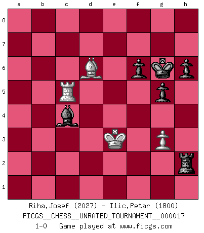 Last move : 1-0 2011 October 8 23:39:54 [Event "FICGS__CHESS__UNRATED_TOURNAMENT__000017"] [Site "FICGS"] [Date "2011.04.18"] [Round "1"] [White "Riha,Josef"] [Black "Ilic,Petar"] [Result "1-0"] [WhiteElo "2027"] [BlackElo "1800"] 1.e4 e5 2.Nf3 Nc6 3.Bc4 Bc5 4.b4 Bxb4 5.c3 Ba5 6.O-O Nf6 7.d4 O-O 8.dxe5 Nxe4 9.Qd5 Nxc3 10.Nxc3 Bxc3 11.Bg5 Qe8 12.Rac1 Bxe5 13.Bb5 h6 14.Bh4 d6 15.Nxe5 dxe5 16.Bxc6 bxc6 17.Qxc6 Be6 18.Qc5 Qa4 19.Bg3 f6 20.f4 exf4 21.Bxf4 Qxa2 22.Bxc7 Rf7 23.Ra1 Qc4 24.Rfc1 Qxc5+ 25.Rxc5 Rd7 26.Bf4 Kf7 27.R1a5 a6 28.Rc6 Bd5 29.Rcxa6 Rxa6 30.Rxa6 Rb7 31.g3 Rb1+ 32.Kf2 Rb2+ 33.Ke3 g5 34.Ra7+ Kg6 35.Bd6 Rxh2 36.Ra5 Bc4 37.Rc5 1-0 This chess game has been lost on time (started : 2011.04.18 16:18:47) Evans gambit Kingside Castling by player White (move 6) Kingside Castling by player Black (move 7) 10 pieces endgame at move 35 : White KRBP , Black KRBPPP WHITE : King + 1 Rook 1 Bishop 1 Pawn BLACK : King + 1 Rook 1 Bishop 3 Pawns Player White won this chess game. Follow this game move after move (download)Fischer is under obligation to nobody. (Joseph Platz) Wenn Schach ein enormer Dschungel ist, der seine Myriaden von Geheimnissen nicht preisgeben will, dann sind Computer die Kettensägen einer gewaltigen ökologisch unsensiblen Nutzholzfirma. (Nigel Short) Antes de los Finales, los dioses han colocado el Juego Medio. (Siegbert Tarrasch) Mon pion favori sur ma case favorite ! Bronstein en parlant d'un coup de pion en h5 quand il avait les Noirs. Knowledge rests not upon truth alone, but upon error also. (Carl G. Jung)