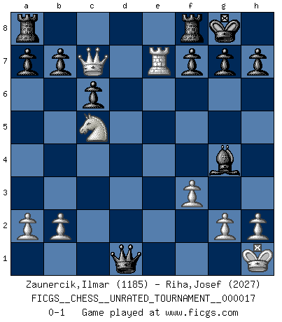 Last move : 0-1 2011 May 15 6:59:38 [Event "FICGS__CHESS__UNRATED_TOURNAMENT__000017"] [Site "FICGS"] [Date "2011.04.18"] [Round "1"] [White "Zaunercik,Ilmar"] [Black "Riha,Josef"] [Result "0-1"] [WhiteElo "1185"] [BlackElo "2027"] 1.e4 e5 2.Nf3 Nc6 3.Bb5 Nf6 4.O-O Nxe4 5.Re1 Nd6 6.Nc3 Nxb5 7.Nxb5 Be7 8.Nxe5 Nxe5 9.Rxe5 O-O 10.d4 d5 11.Nc3 c6 12.Qf3 Bf6 13.Re2 Bxd4 14.Bd2 Qf6 15.Qg3 Qg6 16.Qc7 Bg4 17.Re7 Bc5 18.Rae1 Qxc2 19.Be3 d4 20.Rc1 Qd3 21.f3 dxe3 22.Ne4 e2 23.Nxc5 Qd4+ 24.Kh1 Qd1+ 25.Rxd1 exd1Q+ 0-1 Ruy Lopez : Berlin defense, Open variation Kingside Castling by player White (move 4) Kingside Castling by player Black (move 9) Promotion Queen by player Black (move 25) Player Black won this chess game. Follow this game move after move (download)Chess is a part of culture and if a culture is declining then Chess too will decline. (Mikhail Botvinnik) Wenn Du nicht kämpfst, um anderen etwas zu beweisen, sondern nur für Dich selbst, dann bist du fast unbesiegbar. (Garry Kasparov) El Ajedrez es una manera fabulosa para que los niños aprendan a autovalorarse y a autoestimarse. (Saudin Robovic) Tous ces prétendus hommes politiques sont les pions, les Cavaliers, les Tours ou les Fous d'une partie d'échecs qui se jouera tant qu'un hasard ne renversera pas l'échiquier. (Honoré de Balzac) A belief is an idea the mind possesses, an idea that possesses the mind. (Robert Oxden Bolton)
