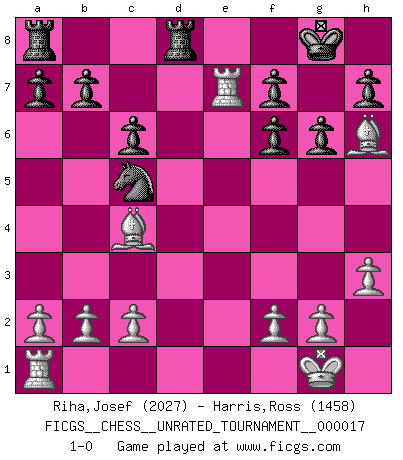 Last move : 1-0 2011 April 19 23:8:25 [Event "FICGS__CHESS__UNRATED_TOURNAMENT__000017"] [Site "FICGS"] [Date "2011.04.18"] [Round "1"] [White "Riha,Josef"] [Black "Harris,Ross"] [Result "1-0"] [WhiteElo "2027"] [BlackElo "1458"] 1.e4 c6 2.d4 d5 3.Nc3 dxe4 4.Nxe4 Nf6 5.Bd3 Qxd4 6.Nf3 Qd8 7.O-O Bg4 8.h3 Bxf3 9.Nxf6+ exf6 10.Re1+ Be7 11.Qxf3 O-O 12.Qe4 g6 13.Qxe7 Nd7 14.Bh6 Qxe7 15.Rxe7 Rfd8 16.Bf1 Nc5 17.Bc4 1-0 Caro-Kann : Alekhine gambit Kingside Castling by player White (move 7) Kingside Castling by player Black (move 11) Player White won this chess game. Follow this game move after move (download)All I want to do, ever, is just play Chess. (Bobby Fischer) Weshalb minderdergeübte Spieler mit g2-g4 beginnen? Die betreffenden sind unschlüssig, ob sie nun rechts (h4) oder links (f4) beginnen sollen, und in ihrer Ratlosigkeit entschliessen sie sich nach guter Bürgerart dazu, den goldenen Mittelweg zu wählen. (Aaron Nimzowitsch) La vida es como un juego de Ajedrez, cambiando con cada movimiento. (Proverbio Chino) Aidez vos pièces, elles vous aideront. (Paul Morphy) It's not a bug - it's an undocumented feature. (Anonymous)