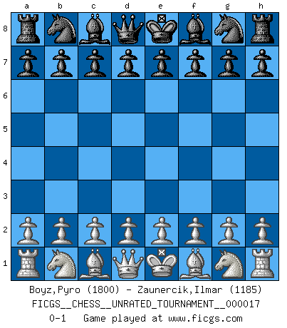 Last move : 0-1 2011 May 28 18:51:33 [Event "FICGS__CHESS__UNRATED_TOURNAMENT__000017"] [Site "FICGS"] [Date "2011.04.18"] [Round "1"] [White "Boyz,Pyro"] [Black "Zaunercik,Ilmar"] [Result "0-1"] [WhiteElo "1800"] [BlackElo "1185"] 0-1 This chess game has been lost on time (started : 2011.04.18 16:18:47) Player Black won this chess game. Follow this game move after move (download)Chess is a terrible game. If you have no center, your opponent has a freer position. If you do have a center, then you really have something to worry about ! (Siegbert Tarrasch) Kein Großmeister ist normal. Sie unterscheiden sich nur im Ausmaß Ihrer Verrücktheit. (Viktor Kortschnoi) Con el tiempo, empecé a progresar en partidas decisivas. Tal vez porque me di cuenta de una simple verdad: no solo estaba yo nervioso sino también mi oponente. (Mikhail Tal) Des points faibles ou des trous dans la position de l'adversaire doivent être occupés par des pièces et non pas par des pions. (Siegbert Tarrasch) There are lots of people who mistake their imagination for their memory. (Josh Bilings)