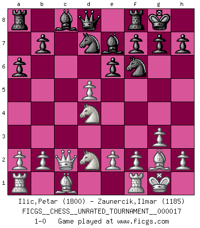 Last move : 1-0 2011 June 30 20:9:32 [Event "FICGS__CHESS__UNRATED_TOURNAMENT__000017"] [Site "FICGS"] [Date "2011.04.18"] [Round "1"] [White "Ilic,Petar"] [Black "Zaunercik,Ilmar"] [Result "1-0"] [WhiteElo "1800"] [BlackElo "1185"] 1.d4 d5 2.c4 e6 3.Nf3 Nf6 4.g3 Be7 5.Bg2 O-O 6.O-O Nbd7 7.Nbd2 c5 8.Qc2 cxd4 9.Nxd4 a6 10.cxd5 1-0 This chess game has been lost on time (started : 2011.04.18 16:18:47) Queen's gambit declined Kingside Castling by player Black (move 5) Kingside Castling by player White (move 6) Player White won this chess game. Follow this game move after move (download)The battle for the ultimate truth will never be won. And that's why Chess is so fascinating. (Hans Kmoch) Ich spiele 70 Eröffnungssysteme. (Viktor Kortschnoi) Una partida de Ajedrez se divide en 3 etapas: la primera cuando piensas que tienes la ventaja, la segunda cuando crees que tienes la ventaja y la tercera... ¡cuando te das cuenta que vas a perder!. (Savielly Tartakower) Botvinnik disait en comparant les échecs à la musique: Il existe une science dont le but est l'étude de l'acoustique et des sons. Mais il y a aussi un art qui se sert de l'océan des sons : c'est la musique. De toute évidence, il en est de même pour la pensée. La logique est l'étude des lois de la réflexion et les échecs reflètent, en tant qu'art, le côté logique de la réflexion, sous la forme d'images artistiques... Extrait de Fischer - Spassky, Reykjavik 1972 par Alexander & F. Wyndham (Ed. Solar), p 37. The beginning is the most important part of the work. (Plato)
