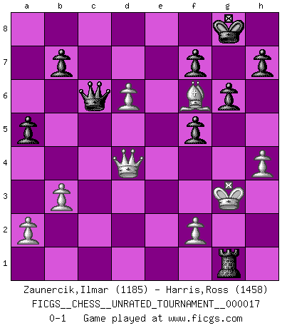 Last move : 0-1 2011 June 19 9:35:0 [Event "FICGS__CHESS__UNRATED_TOURNAMENT__000017"] [Site "FICGS"] [Date "2011.04.18"] [Round "1"] [White "Zaunercik,Ilmar"] [Black "Harris,Ross"] [Result "0-1"] [WhiteElo "1185"] [BlackElo "1458"] 1.e4 c6 2.d4 d5 3.Nc3 dxe4 4.Nxe4 Nf6 5.Nxf6+ exf6 6.Nf3 Bd6 7.Bc4 O-O 8.O-O Bg4 9.h3 Bh5 10.Re1 Nd7 11.Be3 Qc7 12.Qd2 Bxf3 13.gxf3 Nb6 14.Bb3 a5 15.c4 Bb4 16.Qd3 Bxe1 17.Rxe1 Rfe8 18.Kh1 Nd7 19.Rg1 Nf8 20.h4 Ne6 21.Bh6 g6 22.Rg4 f5 23.Rg3 Rad8 24.d5 Qe5 25.Be3 Nf4 26.Qd2 Nh5 27.Rg1 cxd5 28.cxd5 Ra8 29.Ba4 Red8 30.Rd1 Nf6 31.d6 Ne4 32.fxe4 Qxe4+ 33.Kg1 Qxa4 34.b3 Qd7 35.Bg5 Re8 36.Qd4 Re6 37.Be7 Re8 38.Bf6 Re1+ 39.Rxe1 Rxe1+ 40.Kg2 Qc6+ 41.Kh2 Rh1+ 42.Kg3 Rg1+ 0-1 Caro-Kann : Tartakower (Nimzovich) variation Kingside Castling by player Black (move 7) Kingside Castling by player White (move 8) Player Black won this chess game. Follow this game move after move (download)When asked, -How is that you pick better moves than your opponents?, I responded: I'm very glad you asked me that, because, as it happens, there is a very simple answer. I think up my own moves, and I make my opponent think up his. (Alexander Alekhine) Es ist wirklich schade, dass so viele Schachspieler nicht auf ihr Äußeres achten! (Alexandra Kosteniuk) Si un gobernante no entiende al Ajedrez, ¿como puede governar él un reinado?. (El Rey Khusros II) On a dit que l'homme se distingue de l'animal par le fait qu'il achète plus de livres qu'il ne peut en lire. Je voudrais suggérer qu'inclure à la liste des livres quelques livres d'échecs rendrait la distinction manifeste. (Edward Lasker) 98% of all statistics are made up. (Author unknown)