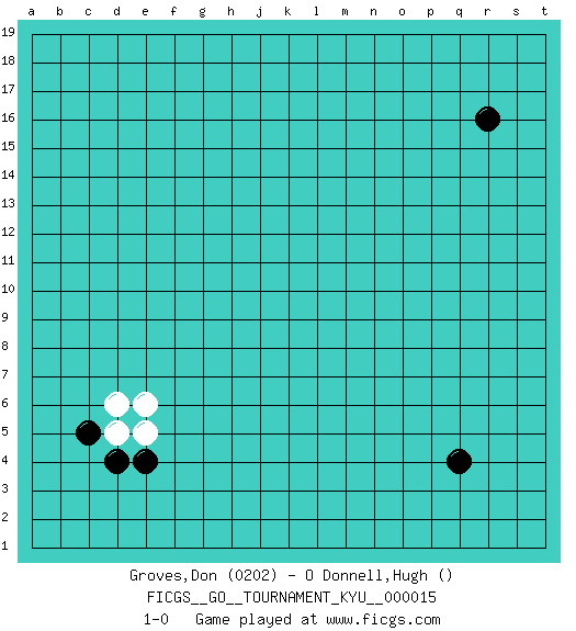 Last move : 1-0 2007 January 25 13:8:37 [Event "FICGS__GO__TOURNAMENT_KYU__000015"] [Site "FICGS"] [Date "2006.12.21"] [Round "1"] [Black "Groves,Don"] [White "O Donnell,Hugh"] [Result "1-0"] [Rating 1 "0202"] 1.d4 d5 2.c5 d6 3.r16 e5 4.e4 e6 5.q4 1-0 This go game has been lost on time (started : 2006.12.21 5:16:51) Here are the names of the openings (joseki) played in the four corners : Corner d4 : d4 d5 Hoshi (Hwajeom, Seongjeom, Xingwei`) 4-4 Point. The star or hoshi (4-4) point, emphasizing influence at the potential expense of territory. Corner q4 : q4 1-0 Hoshi (Hwajeom, Seongjeom, Xingwei`) 4-4 Point. The star or hoshi (4-4) point, emphasizing influence at the potential expense of territory. Player Black won this Go (weiqi, baduk) game. Follow this game move after move (download)Big groups never die. (Anonymous) If computers get too powerful, we can organize them into committees. That'll do them in. (Anonymous)