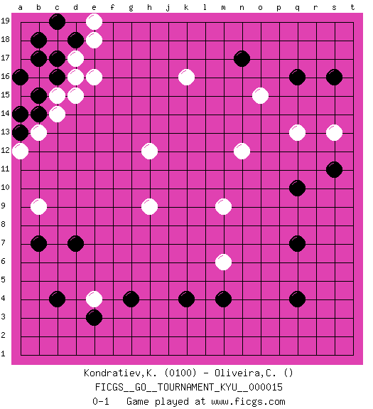 Last move : 0-1 2007 March 9 19:4:57 [Event "FICGS__GO__TOURNAMENT_KYU__000015"] [Site "FICGS"] [Date "2006.12.21"] [Round "1"] [Black "Kondratiev,Konstantin"] [White "Oliveira,Carlos"] [Result "0-1"] [Rating 1 "0100"] 1.q16 e4 2.q4 e16 3.c16 d16 4.c17 c15 5.b15 b16 6.b17 d17 7.d18 c18 8.b18 d15 9.c4 a15 10.b14 c14 11.a16 a14 12.a13 b13 13.e3 a12 14.a14 e18 15.c19 e19 16.k4 h12 17.q10 k16 18.g4 h9 19.n17 m9 20.q7 n12 21.d7 b9 22.b7 m6 23.m4 q13 24.s16 s13 25.s11 o15 0-1 This go game has been lost on time (started : 2006.12.21 5:16:51) Here are the names of the openings (joseki) played in the four corners : Corner d16 : e16 c16 Takamoku (Gomok, Gaomu`) 5-4 Point. The takamoku (high) point (5-4). With its emphasis on influence, the 5-4 point complements the 4-4 (hoshi) point in creating an influence-oriented fuseki. Komoku. White responds with 3-3, 3-5, 4-6, 4-7, 3-6, 3-7. Corner d4 : e4 c4 Takamoku (Gomok, Gaomu`) 5-4 Point. The takamoku (high) point (5-4). With its emphasis on influence, the 5-4 point complements the 4-4 (hoshi) point in creating an influence-oriented fuseki. Komoku. White responds with 3-3, 3-5, 4-6, 4-7, 3-6, 3-7. Corner q4 : q4 m9 Hoshi (Hwajeom, Seongjeom, Xingwei`) 4-4 Point. The star or hoshi (4-4) point, emphasizing influence at the potential expense of territory. Player White won this Go (weiqi, baduk) game. Follow this game move after move (download)Win the early ko to win the game. (Anonymous) Somehow our devils are never quite what we expect when we meet them face to face. (Nelson DeMille)