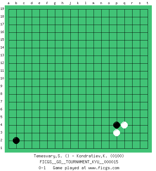 Last move : 0-1 2007 January 22 18:54:16 [Event "FICGS__GO__TOURNAMENT_KYU__000015"] [Site "FICGS"] [Date "2006.12.21"] [Round "1"] [Black "Temesvary,Sandor"] [White "Kondratiev,Konstantin"] [Result "0-1"] [Rating 2 "0100"] 1.b2 q4 2.p4 p3 0-1 This go game has been lost on time (started : 2006.12.21 5:16:51) Here are the names of the openings (joseki) played in the four corners : Corner q4 : q4 p4 Hoshi (Hwajeom, Seongjeom, Xingwei`) 4-4 Point. The star or hoshi (4-4) point, emphasizing influence at the potential expense of territory. Player White won this Go (weiqi, baduk) game. Follow this game move after move (download)When your opponent is thick, you must also become thick. (Otake Hideo, 9p) I couldn't make any sense out of what this particular thread is about. It sounds like R2 D2 computer speaking. A space fight ?!? Some 'command' problems in Moscow ? Some killers & narcotic addicts attacking some game & a god wannabe ?? (Dinesh De Silva, lost in a russian conflict in FICGS forum)
