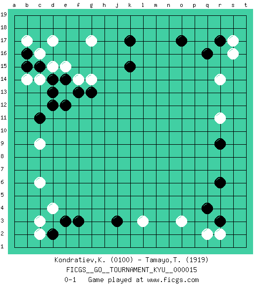 Last move : 0-1 2007 February 28 12:4:21 [Event "FICGS__GO__TOURNAMENT_KYU__000015 "] [Site "FICGS"] [Date "2006.12.21"] [Round "1"] [Black "Kondratiev,Konstantin "] [White "Tamayo,Thomas "] [Result "0-1"] [Rating 1 "0100"] [Rating 2 "1919"] 1.q16 d4 2.q4 d17 3.c15 r14 4.o17 s16 5.r17 r11 6.d12 g17 7.f3 c6 8.d2 c3 9.j3 c9 10.c11 o3 11.r6 q2 12.r3 l3 13.k17 c2 14.e3 c16 15.b16 b17 16.b15 d15 17.d14 e15 18.e14 f14 19.f13 g14 20.g13 e13 21.e12 c14 22.d13 b14 23.r9 s17 24.k15 r2 0-1 This go game has been lost on time (started : 2006.12.21 5:16:51) Here are the names of the openings (joseki) played in the four corners : Corner d16 : d17 c15Komoku (Somok, Xiao~mu`) 3-4 Point. The komoku (3-4) point is the traditional corner enclosure move..Ikken Kakari (Hankan Keolch'im, Yi Gua`jiao~, 1-Space Low Pincer). The small knight move is the basic approach move to the 3-4 point stone. It has been continually used for over four centuries. There are limitless variations, with new moves constantly being discovered. Black 2 opens the door to a treaure store of joseki. Corner q16 : q16 r14Hoshi (Hwajeom, Seongjeom, Xingwei`) 4-4 Point. The star or hoshi (4-4) point, emphasizing influence at the potential expense of territory.Ikken Kakari (Hankan Keolch'im, Yi Gua`jiao~, 1-Space Low Approach). White 2 is the standard approach move to the 4-4. Corner d4 : d4 f3Hoshi (Hwajeom, Seongjeom, Xingwei`) 4-4 Point. The star or hoshi (4-4) point, emphasizing influence at the potential expense of territory.Ikken Kakari (Hankan Keolch'im, Yi Gua`jiao~, 1-Space Low Approach). Black 2 is the standard approach move to the 4-4. Corner q4 : q4 o3Hoshi (Hwajeom, Seongjeom, Xingwei`) 4-4 Point. The star or hoshi (4-4) point, emphasizing influence at the potential expense of territory.Ikken Kakari (Hankan Keolch'im, Yi Gua`jiao~, 1-Space Low Approach). White 2 is the standard approach move to the 4-4. Player White won this Go (weiqi, baduk) game.Follow this game move after move (download ) Five liberties for tactical stability. (Anonymous) We're missing something. (Gregory House, House M.D.)
