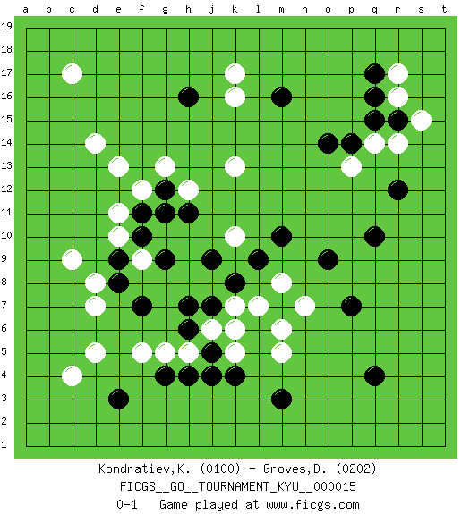 Last move : 0-1 2007 February 28 18:5:14 [Event "FICGS__GO__TOURNAMENT_KYU__000015"] [Site "FICGS"] [Date "2006.12.21"] [Round "1"] [Black "Kondratiev,Konstantin"] [White "Groves,Don"] [Result "0-1"] [Rating 1 "0100"] [Rating 2 "0202"] 1.q16 c4 2.q4 c17 3.e3 d5 4.g4 c9 5.k4 k16 6.m16 d14 7.q10 k10 8.m10 k13 9.h7 f5 10.f7 g5 11.h4 h5 12.j5 j6 13.j7 k5 14.j4 k7 15.k8 l7 16.h6 k6 17.l9 m8 18.o9 m5 19.m3 n7 20.p7 m6 21.j9 d7 22.e8 d8 23.f11 e10 24.f10 f9 25.e9 e11 26.g9 r14 27.r12 r17 28.q17 r16 29.q15 q14 30.r15 s15 31.p14 p13 32.o14 f12 33.h16 k17 34.h11 h12 35.g12 g13 36.g11 e13 0-1 This go game has been lost on time (started : 2006.12.21 5:16:51) Here are the names of the openings (joseki) played in the four corners : Corner d4 : c4 e3 Komoku (Somok, Xiao~mu`) 3-4 Point. The komoku (3-4) point is the traditional corner enclosure move.. Ikken Kakari (Hankan Keolch'im, Yi Gua`jiao~, 1-Space Low Pincer). The small knight move is the basic approach move to the 3-4 point stone. It has been continually used for over four centuries. There are limitless variations, with new moves constantly being discovered. Black 2 opens the door to a treaure store of joseki. Corner q4 : q4 l7 Hoshi (Hwajeom, Seongjeom, Xingwei`) 4-4 Point. The star or hoshi (4-4) point, emphasizing influence at the potential expense of territory. Player White won this Go (weiqi, baduk) game. Follow this game move after move (download)One point in the center is worth ten in the corner. (Anonymous) You lose, general Kenobi. (General Grievous in Star Wars ep.3)