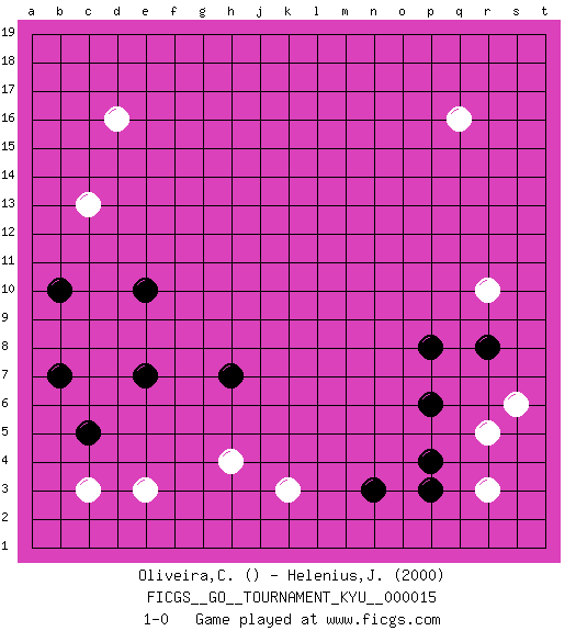 Last move : 1-0 2007 February 20 5:11:16 [Event "FICGS__GO__TOURNAMENT_KYU__000015"] [Site "FICGS"] [Date "2006.12.21"] [Round "1"] [Black "Oliveira,Carlos"] [White "Helenius,Jan-Krister"] [Result "1-0"] [Rating 2 "2000"] 1.b7 q16 2.p4 d16 3.e7 e3 4.e10 c13 5.b10 h4 6.p8 r10 7.c5 c3 8.r8 r3 9.p3 r5 10.p6 s6 11.h7 k3 12.n3 1-0 This go game has been lost on time (started : 2006.12.21 5:16:51) Here are the names of the openings (joseki) played in the four corners : Player Black won this Go (weiqi, baduk) game. Follow this game move after move (download)Attach to the strongest stone in a pincer. (Anonymous) Creativity is allowing yourself to make mistakes. Art is knowing which ones to keep. (Scott Adams)