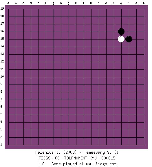 Last move : 1-0 2007 January 21 12:49:54 [Event "FICGS__GO__TOURNAMENT_KYU__000015"] [Site "FICGS"] [Date "2006.12.21"] [Round "1"] [Black "Helenius,Jan-Krister"] [White "Temesvary,Sandor"] [Result "1-0"] [Rating 1 "2000"] 1.r15 q15 2.q16 1-0 This go game has been lost on time (started : 2006.12.21 5:16:51) Here are the names of the openings (joseki) played in the four corners : Corner q16 : r15 q15 Mokuhazushi (Waemok, Wai`mu`) 5-3 Point. The mokuhazushi (5-3) point was popular in the Edo period in Japan (1600 - 1867). It emphasizes influence; territorially, it is inferior to the 3-4 point. Player Black won this Go (weiqi, baduk) game. Follow this game move after move (download)Don't reduce your own liberties. (Bill Taylor) Every man's memory is his private literature. (Aldous Huxley)
