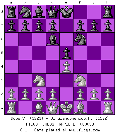 Last move : 0-1 2011 May 30 6:59:30 [Event "FICGS__CHESS__RAPID_E__000053"] [Site "FICGS"] [Date "2011.04.20"] [Round "1"] [White "Dups,Vincent"] [Black "Di Giandomenico,Pierino"] [Result "0-1"] [WhiteElo "1221"] [BlackElo "1172"] 1.e4 e5 2.Nc3 Bd6 3.Nf3 Nf6 0-1 This chess game has been lost on time (started : 2011.04.20 22:23:37) Vienna game Player Black won this chess game. Follow this game move after move (download)The boy (then a 12 year old boy named Anatoly Karpov) doesn't have a clue about Chess, and there's no future at all for him in this profession. (Mikhail Botvinnik) Wir irren allesamt, nur jeder irrt anders. (Georg Christoph Lichtenberg) La captura del Rey enemigo es la finalidad pero no el primer objetivo de la partida. (William Steinitz) Votre prénom est 'Tactique', votre deuxième prénom est 'Tactique' et votre nom est 'Tactique'. (Ken Smith) Art disturbs, science reassures. (Georges Braque, Le Jour et la Nuit)