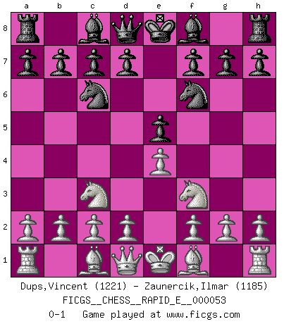 Last move : 0-1 2011 May 29 19:0:17 [Event "FICGS__CHESS__RAPID_E__000053"] [Site "FICGS"] [Date "2011.04.20"] [Round "1"] [White "Dups,Vincent"] [Black "Zaunercik,Ilmar"] [Result "0-1"] [WhiteElo "1221"] [BlackElo "1185"] 1.e4 e5 2.Nc3 Nf6 3.Nf3 Nc6 0-1 This chess game has been lost on time (started : 2011.04.20 22:23:37) Vienna : Falkbeer variation Player Black won this chess game. Follow this game move after move (download)My style is somewhere between that of Tal and Petrosian. (Reshevsky) Schach ist die gewalttätigste aller Sportarten. (Garry Kasparov) Si el Ajedrez es una ciencia, es la mas inexacta. Si el Ajedrez es un arte, es demasiado inexacto para ser visto como tal. Si el Ajedrez es un deporte, es demasiado esotérico. Si el Ajedrez es un juego, es demasiado exigente para ser solo un juego. Si el Ajedrez es una aventura, es una muy demandante. Si el Ajedrez es una pasión, es una muy gratificante. Si el Ajedrez es la vida, es una muy triste. (Anónimo) Shah mat. Le roi est mort. Cri de fierté d'un joueur venant de terrasser son adversaire, courtoisement, sans effusion de sang. There is a great deal of difference between an eager man who wants to read a book and a tired man who wants a book to read. (G.K. Chesterton)