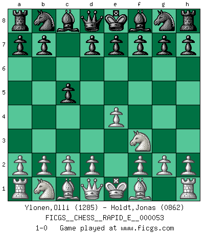Last move : 1-0 2011 May 24 6:46:45 [Event "FICGS__CHESS__RAPID_E__000053"] [Site "FICGS"] [Date "2011.04.20"] [Round "1"] [White "Ylonen,Olli"] [Black "Holdt,Jonas"] [Result "1-0"] [WhiteElo "1285"] [BlackElo "0862"] 1.e4 c5 2.Nf3 1-0 This chess game has been lost on time (started : 2011.04.20 22:23:37) Sicilian defense Player White won this chess game. Follow this game move after move (download)All Chess players should have a hobby. (Savielly Tartakower) Wenn sie aufgeben, dann danke ich Ihnen für das Spiel (Eventualzug beim Fernschach). (Anonymous) Diferente gente reacciona diferentemente en aceptar la derrota. (Bobby Fischer) La conception d'un plan est le processus par lequel un joueur exploite les avantages de sa position tout en s'efforçant d'en réduire au minimum les inconvénients. Afin de garantir le succès, un plan doit toujours se fonder sur un diagnostic objectif des particularités d'une position. La conception d'un plan est d'autant plus difficile que la position est équilibrée, et grandement facilitée lorsqu'il n'existe qu'un seul plan susceptible de répondre aux exigences de la position. (Harry Golombek) If only faces could talk... (Pat Summerall, Sportscaster during the Super Bowl)