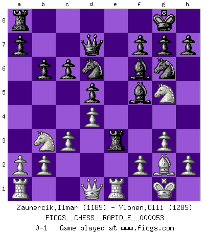 Last move : 0-1 2011 June 29 20:8:25 [Event "FICGS__CHESS__RAPID_E__000053"] [Site "FICGS"] [Date "2011.04.20"] [Round "1"] [White "Zaunercik,Ilmar"] [Black "Ylonen,Olli"] [Result "0-1"] [WhiteElo "1185"] [BlackElo "1285"] 1.e4 e5 2.Nf3 Nf6 3.Nxe5 d6 4.Nf3 Nxe4 5.d4 d5 6.Qe2 Be7 7.Nbd2 Nd6 8.g3 O-O 9.Bg2 Re8 10.O-O Nc6 11.c3 Bf6 12.Qd1 Bf5 13.Nb3 b6 14.Nfd2 Ne7 15.Re1 Qd7 16.Nf3 Ng6 17.Be3 c6 18.Ng5 Rxe3 0-1 This chess game has been lost on time (started : 2011.04.20 22:23:37) Petrov : Classical attack Kingside Castling by player Black (move 8) Kingside Castling by player White (move 10) Player Black won this chess game. Follow this game move after move (download)There must have been a time when men were demigods, or they could not have invented Chess. (Gustav Schenk) Spiel ein langweiliges Spiel zu Ende und lustige Dinge können passieren. (Hans Ree) ¿Que sería del Ajedrez sin errores graciosos?. (Kurt Richter) Il s'avisa de me proposer d'apprendre les échecs qu'il jouait un peu... me voilà forcené des échecs. J'achète un échiquier, je m'enferme dans ma chambre, j'y passe des jours et des nuits à vouloir apprendre par cur toutes les parties. (Jean-Jacques Rousseau, Confessions) If passion drives you, let reason holds the reins. (Benjamin Franklin)