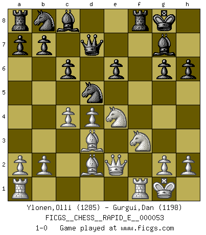 Last move : 1-0 2011 June 24 8:4:5 [Event "FICGS__CHESS__RAPID_E__000053"] [Site "FICGS"] [Date "2011.04.20"] [Round "1"] [White "Ylonen,Olli"] [Black "Gurgui,Dan"] [Result "1-0"] [WhiteElo "1285"] [BlackElo "1198"] 1.e4 d6 2.d4 Nf6 3.Nc3 g6 4.f4 Bg7 5.Nf3 O-O 6.Bd3 c6 7.O-O e6 8.e5 dxe5 9.fxe5 Nd5 10.Bg5 Qd7 11.Ne4 h6 12.Bd2 f5 13.exf6 Nxf6 14.Qe2 Nd5 15.c4 1-0 This chess game has been lost on time (started : 2011.04.20 22:23:37) Pirc : Austrian attack, 6.Bd3 Kingside Castling by player Black (move 5) Kingside Castling by player White (move 7) Player White won this chess game. Follow this game move after move (download)In a gambit you give up a Pawn for the sake of getting a lost game. (Samuel Standige Boden) Kritik überlasse ich den Spießern. Ich zeige nichts, wofür ich mich schämen muss. (Alexandra Kosteniuk) El Peón aislado arroja penumbra sobre todo el tablero. (Aaron Nimzovich) Demandez au pauvre Cg1 ce qu'il en pense. Eduard Gufeld à propos de la variante Saemisch de l'Est-Indienne. As a goal marker shodan is important. As a destination it is a poor place to stop. (Thomas Tamayo)